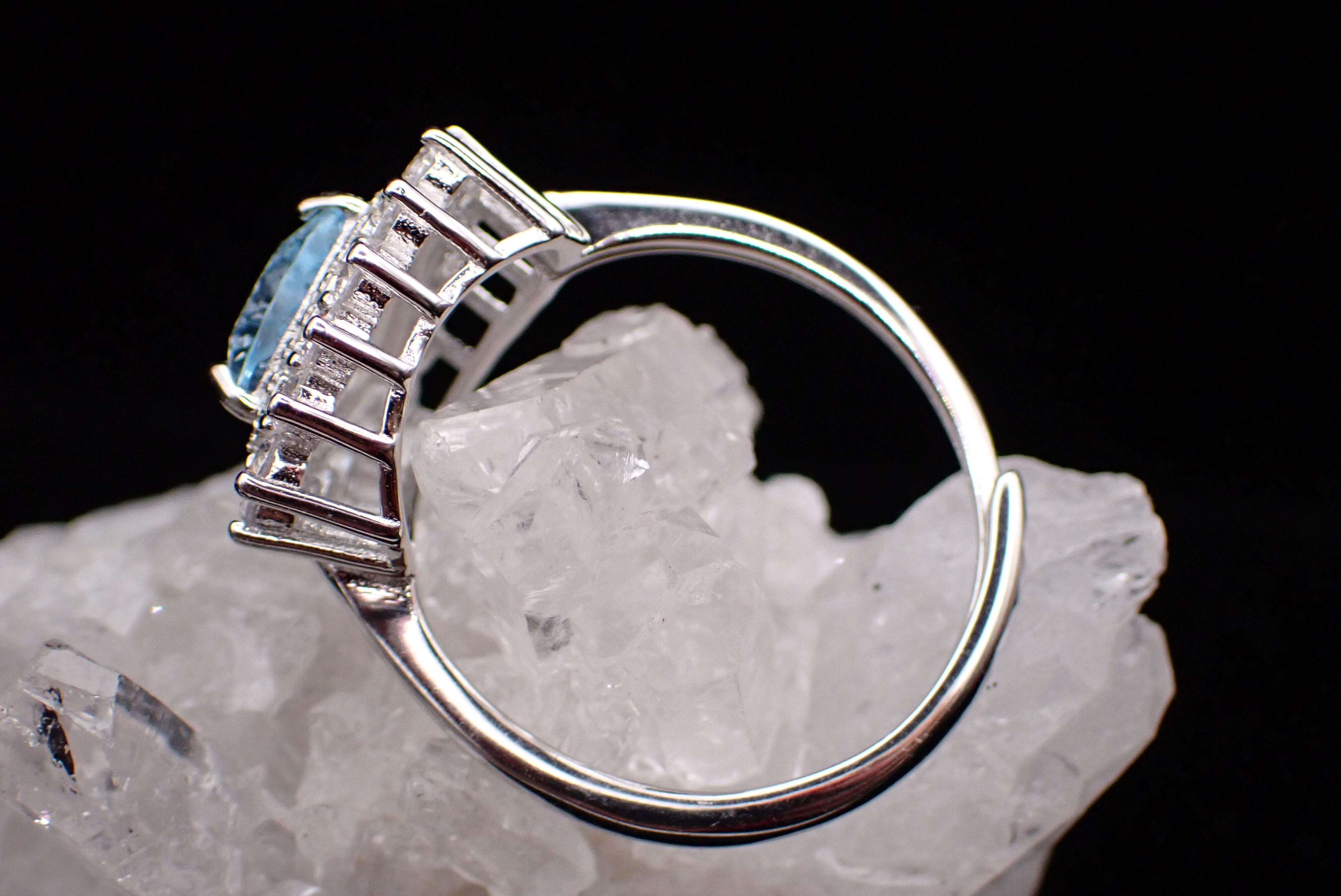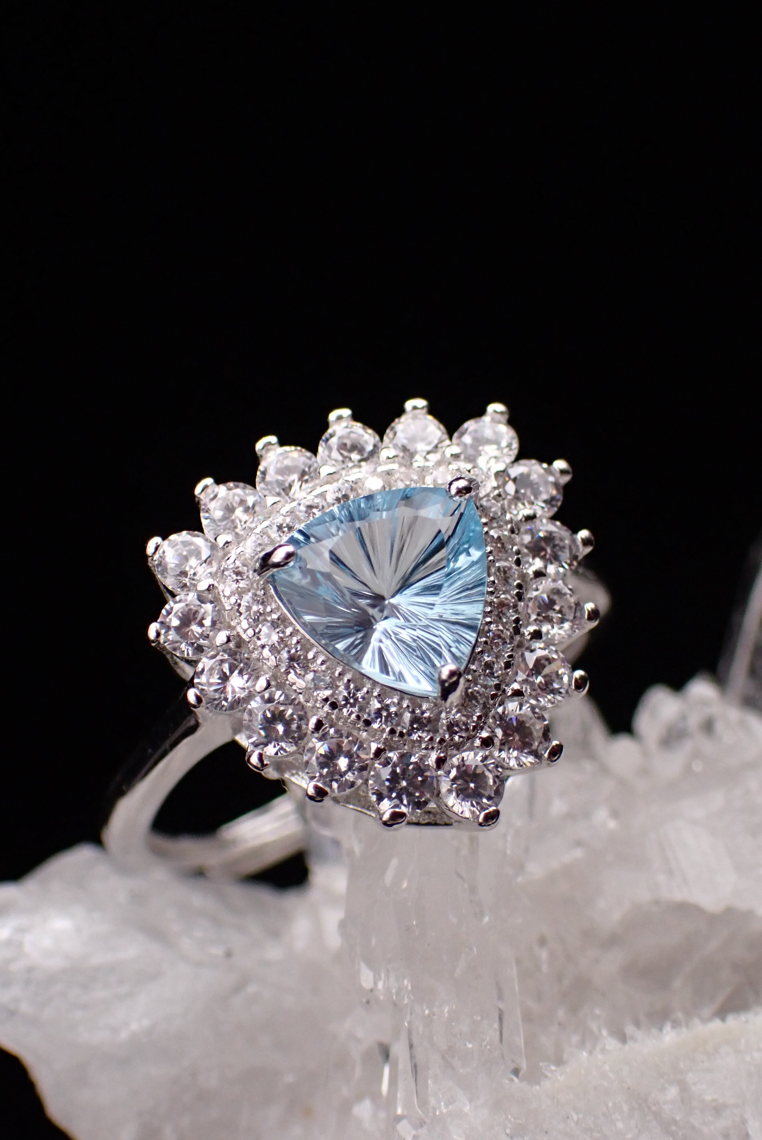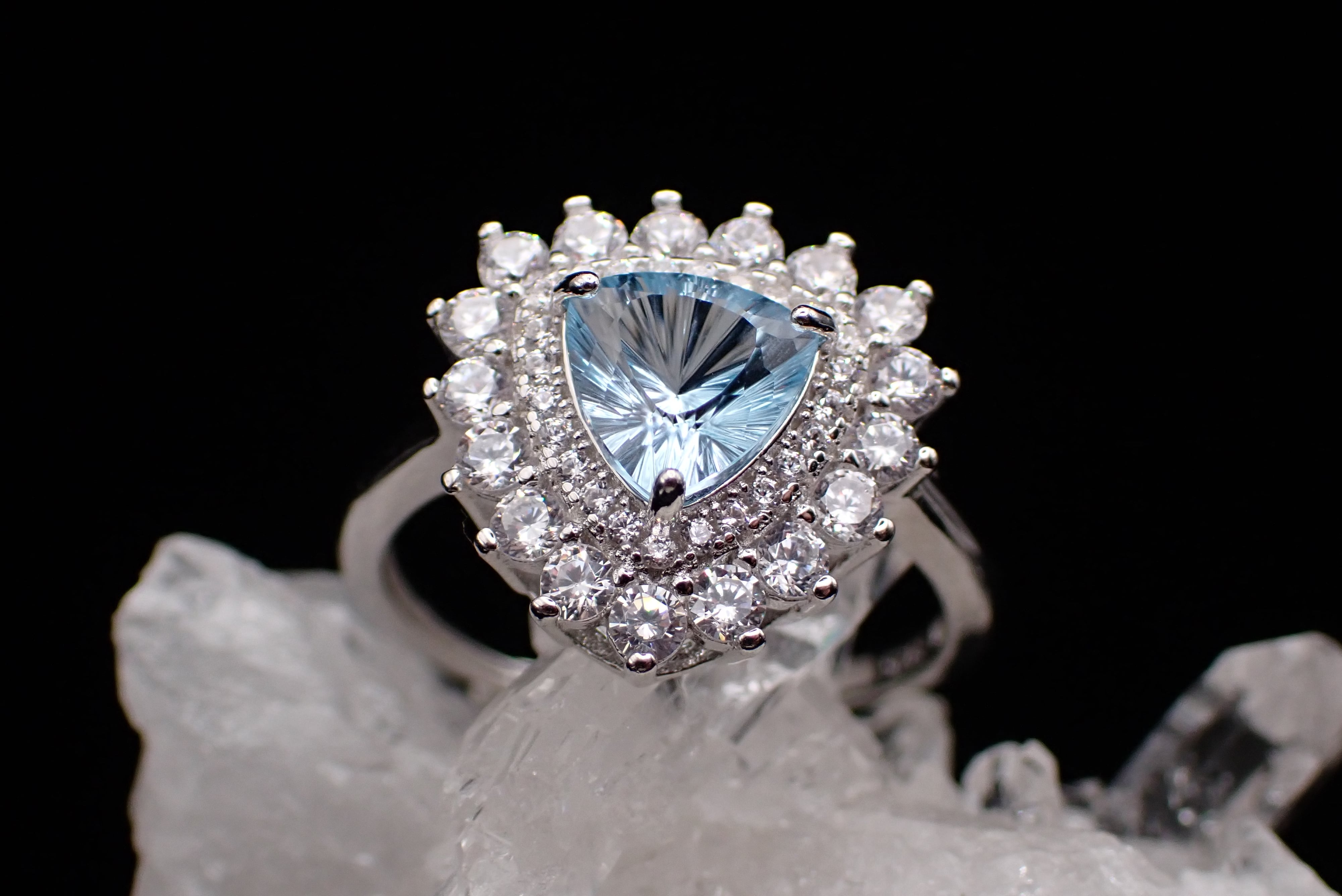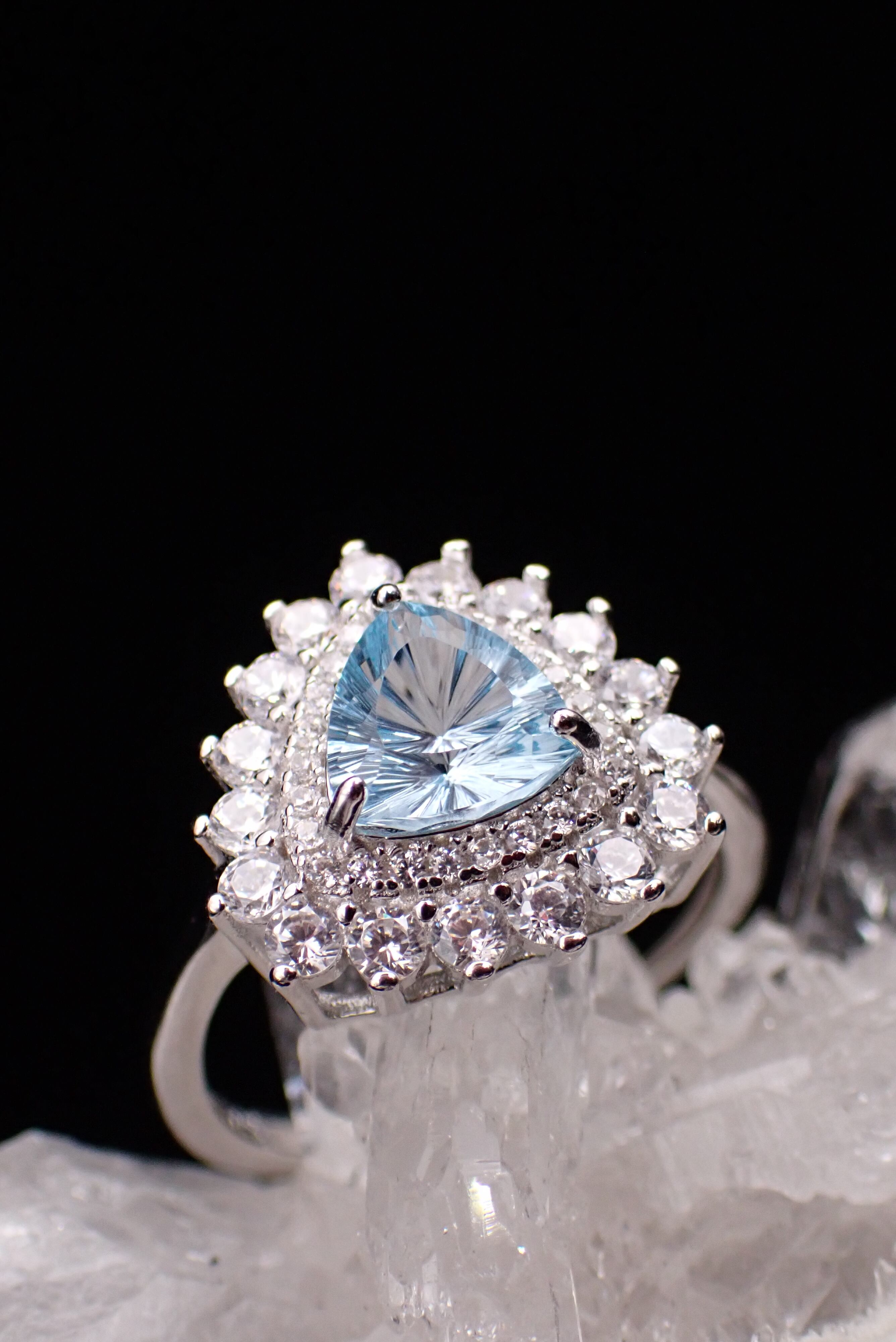 煌びやかに散るジルコニアの中央に佇む、やわらかな水色が美しいコンケーブブルートパーズのリングです。
