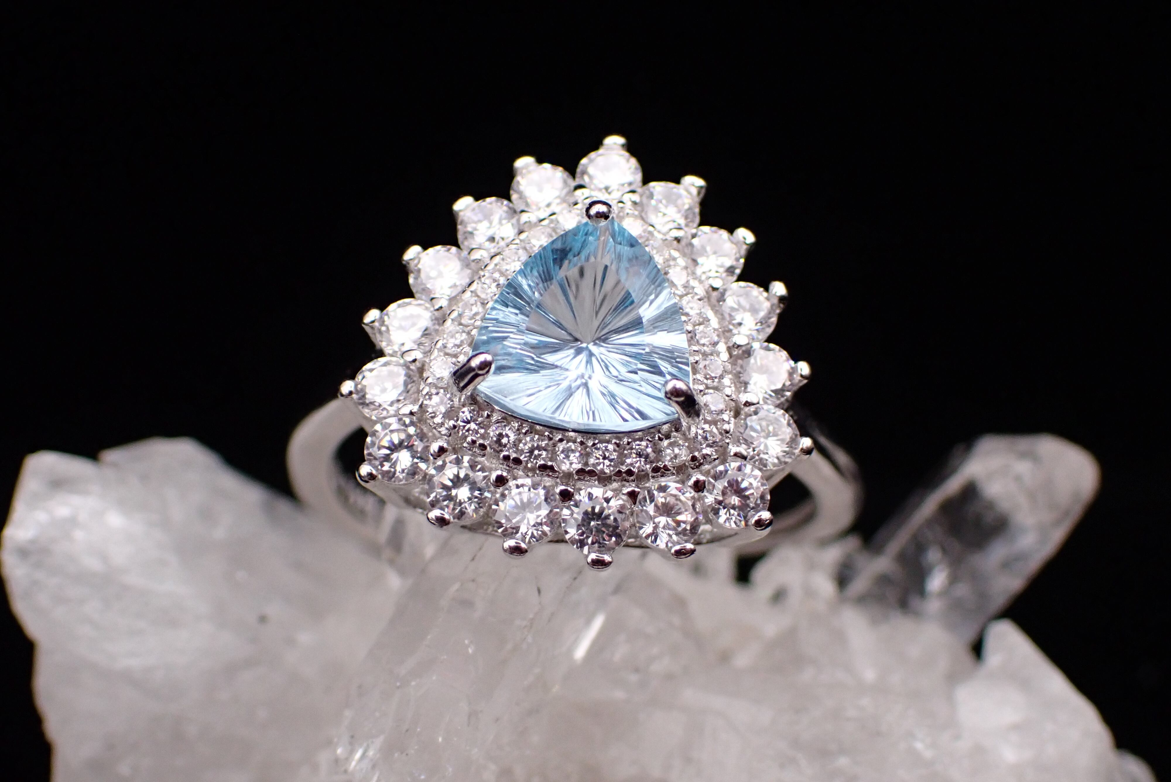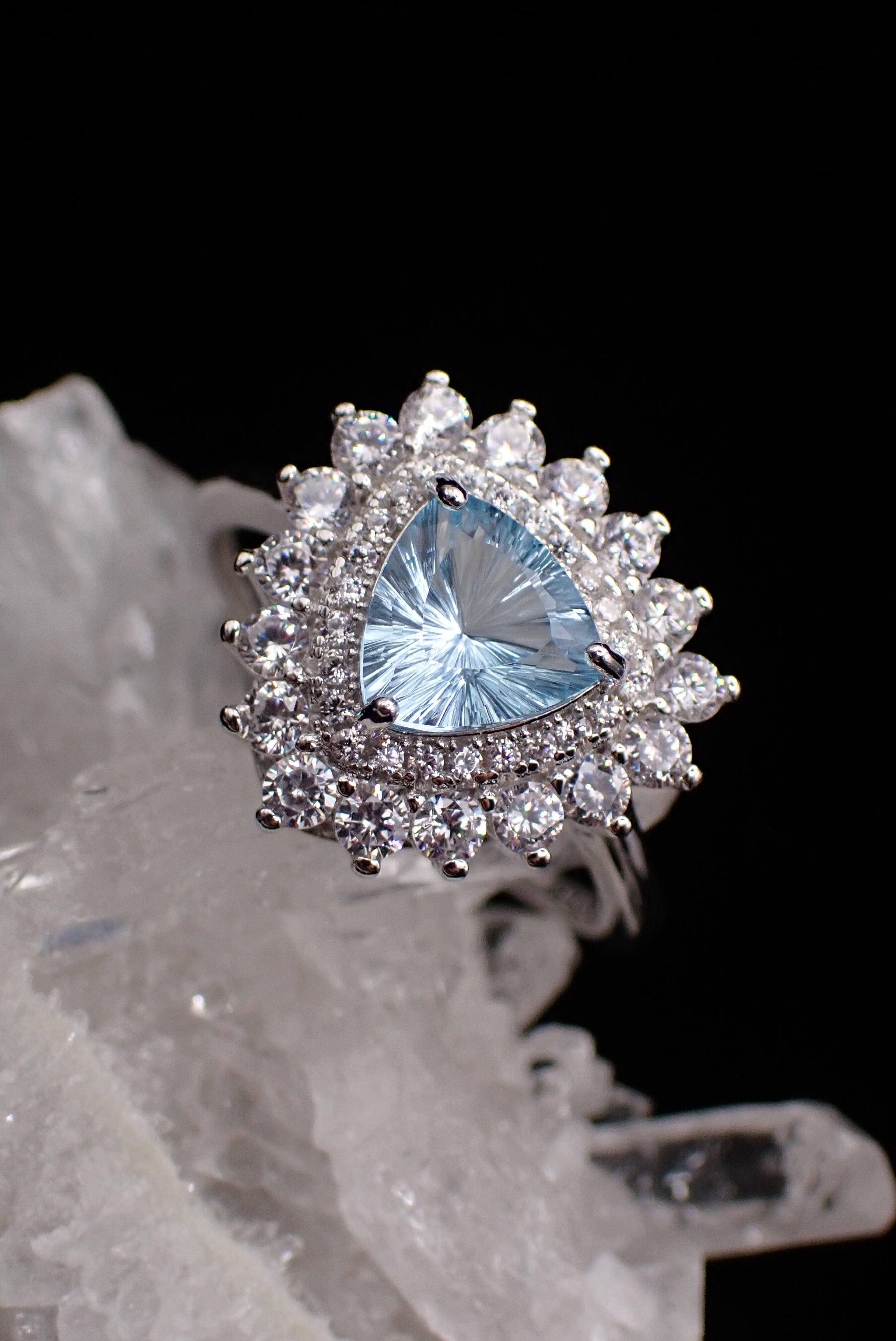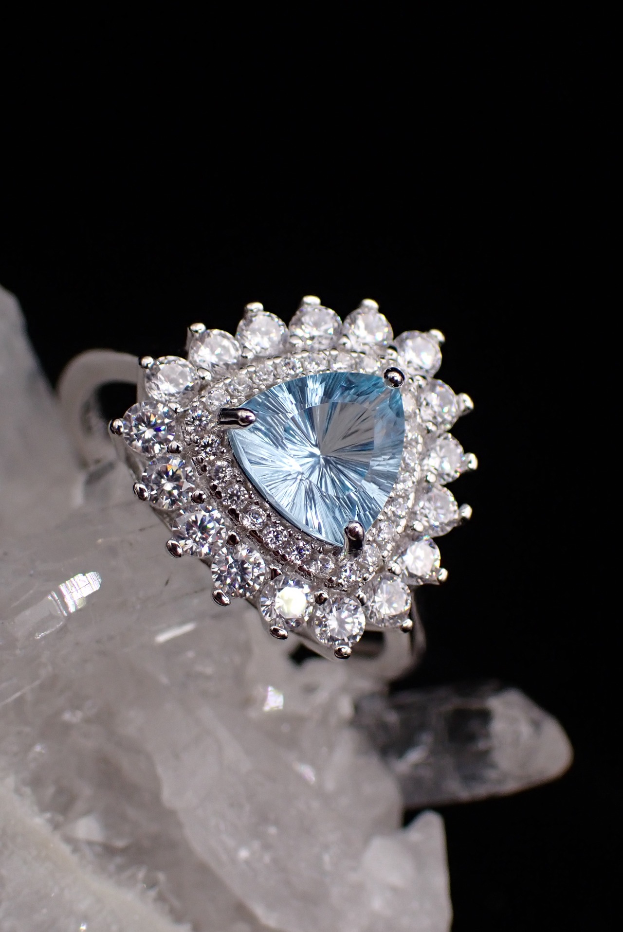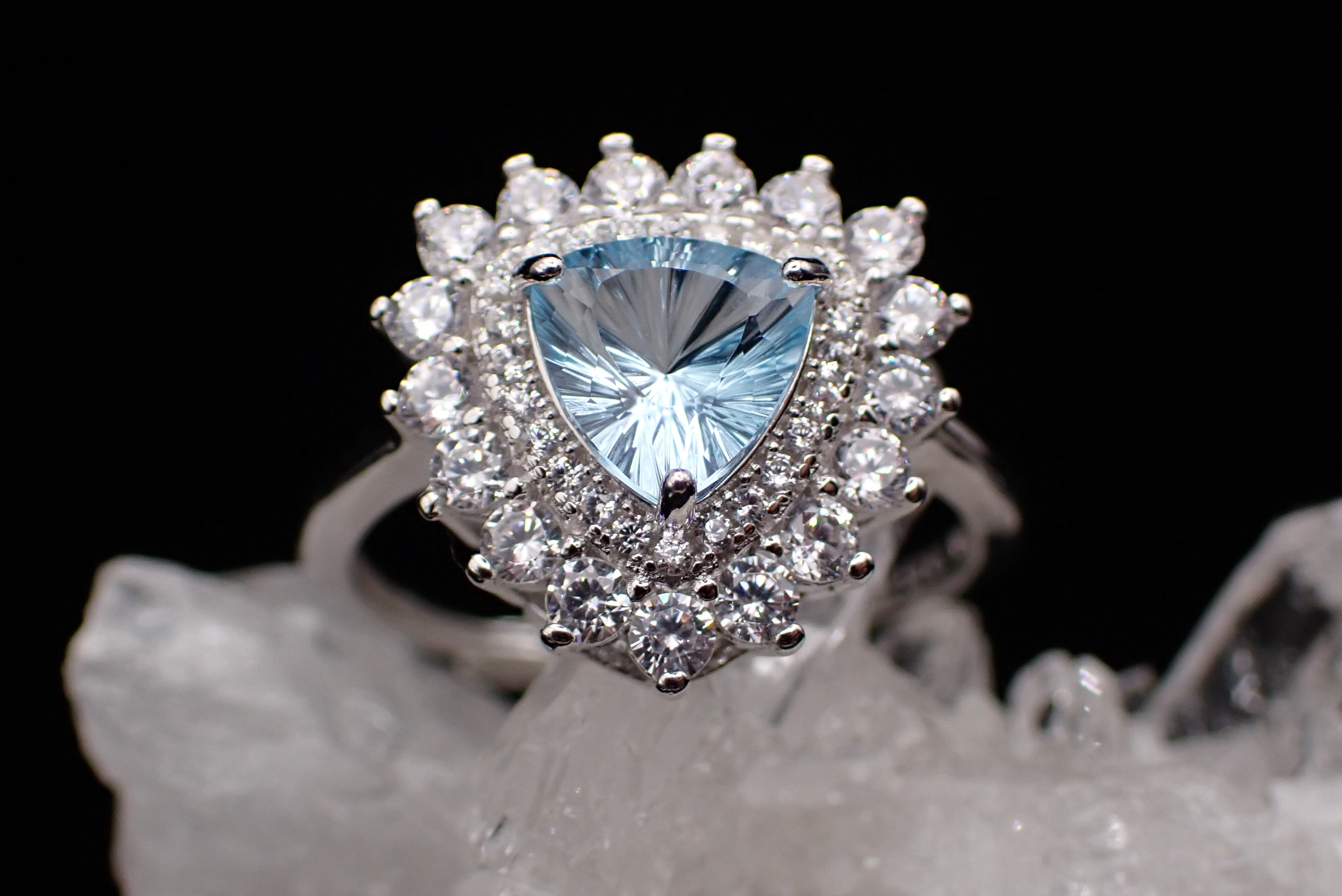煌びやかに散るジルコニアの中央に佇む、やわらかな水色が美しいコンケーブブルートパーズのリングです。