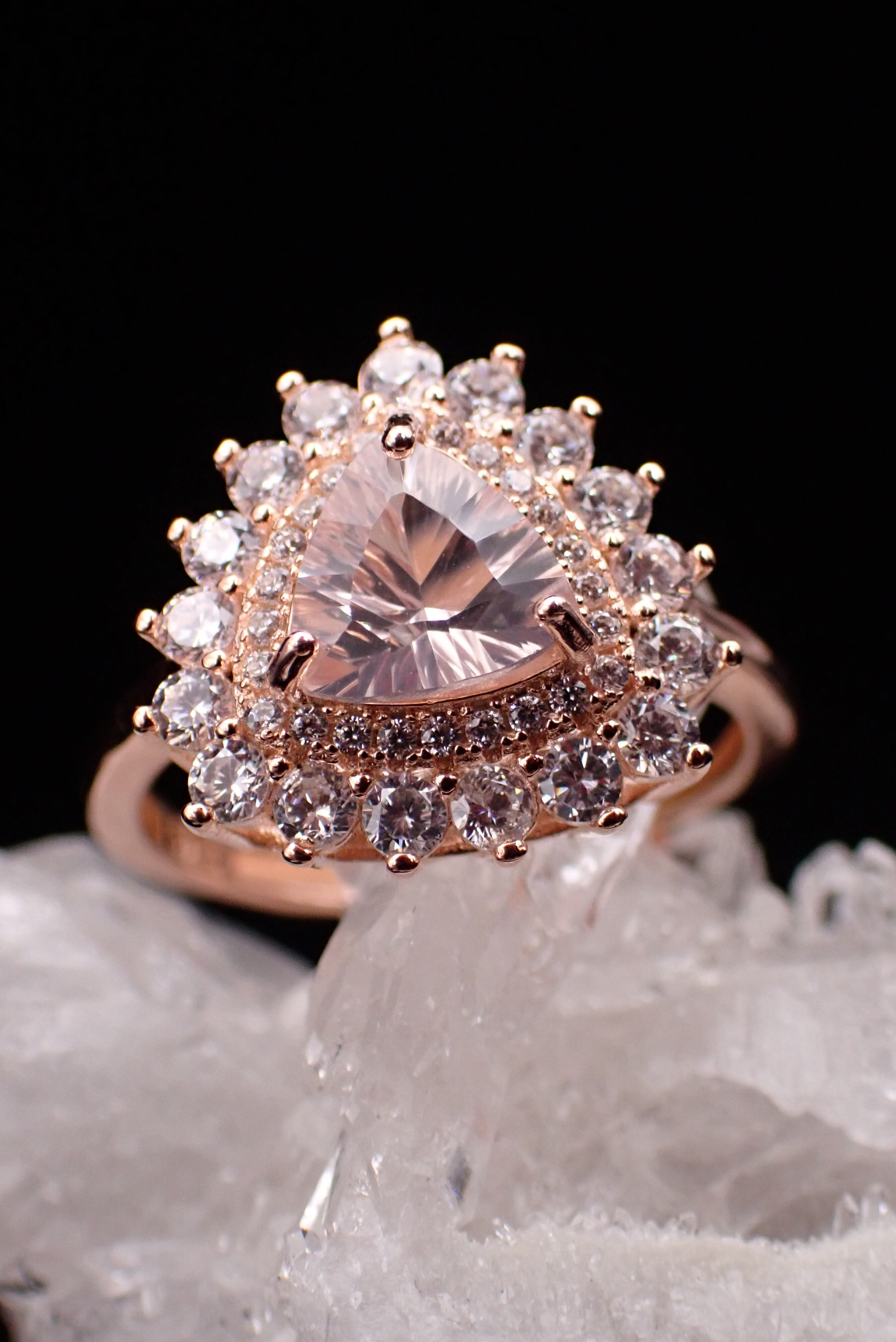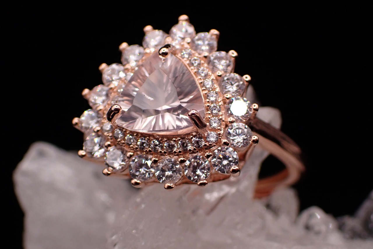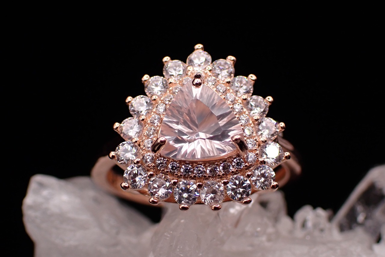 煌びやかに散るジルコニアの中央に佇む、やわらかな桜色が美しいコンケーブローズクォーツのリングです。