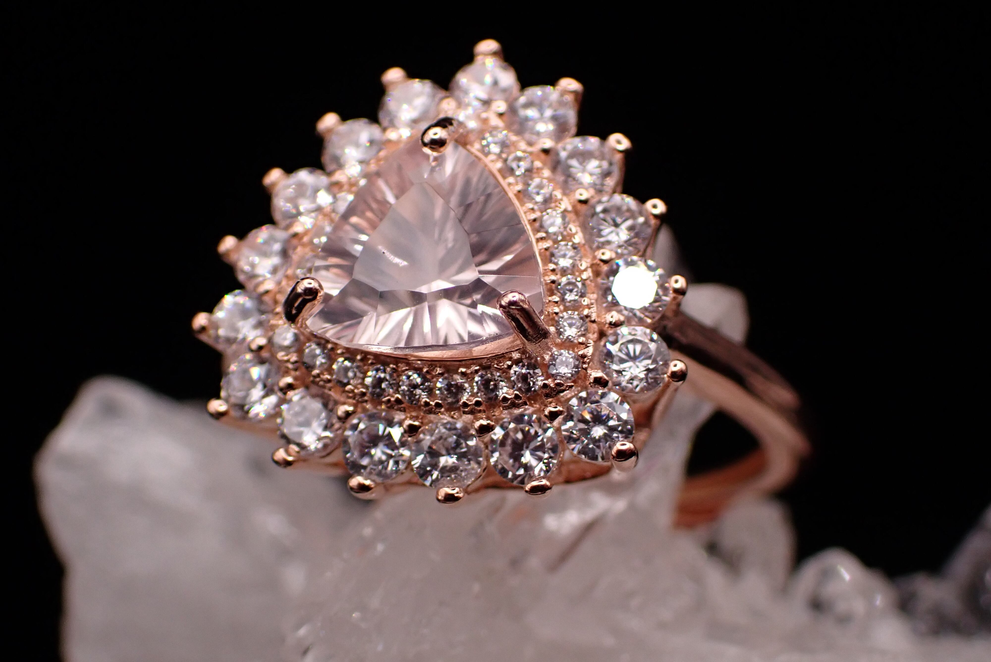 トリリアントカットのローズクォーツとして色むらもなく、ふんわりとした桃色がひろがる素晴らしいピースです。
