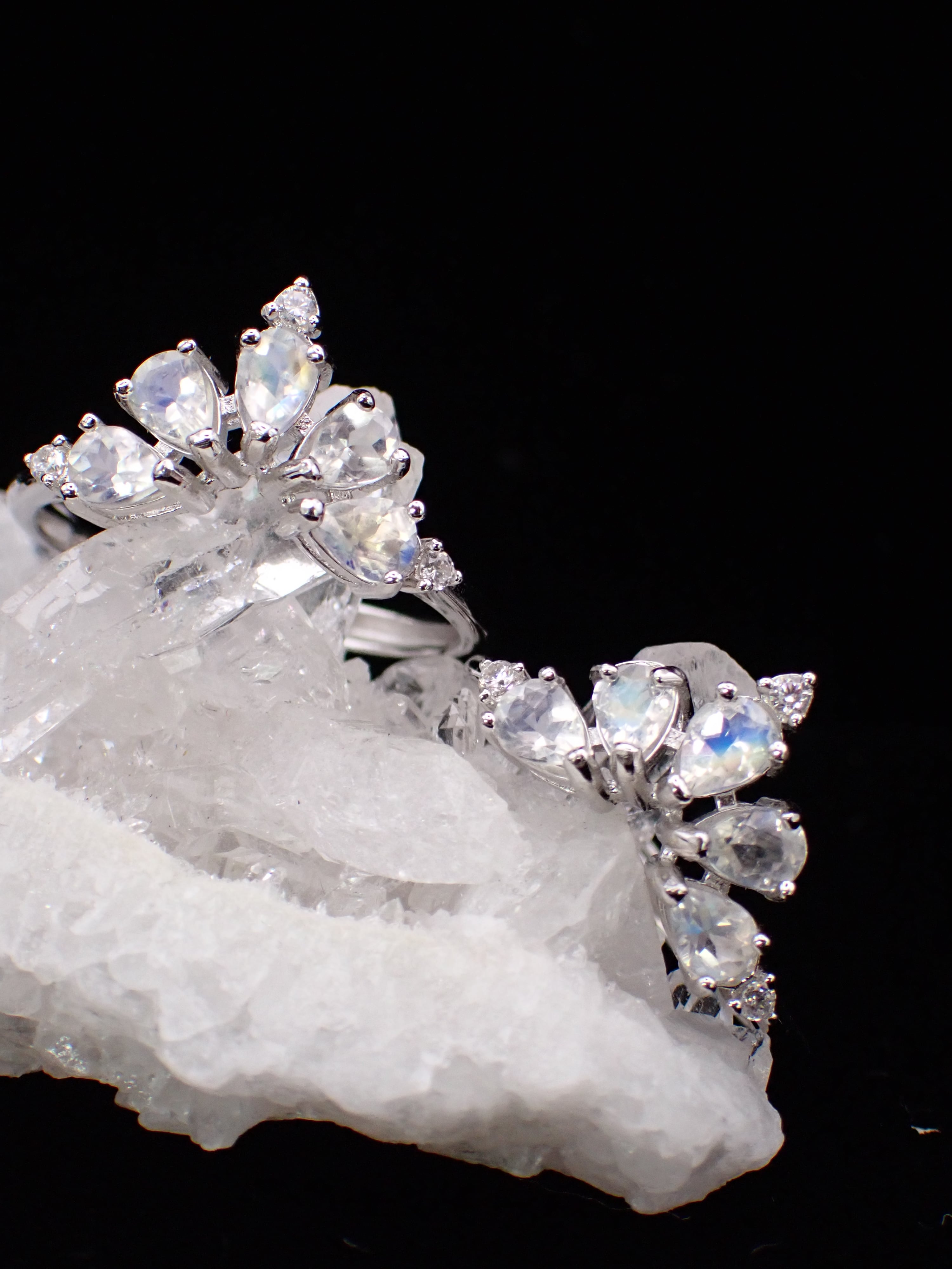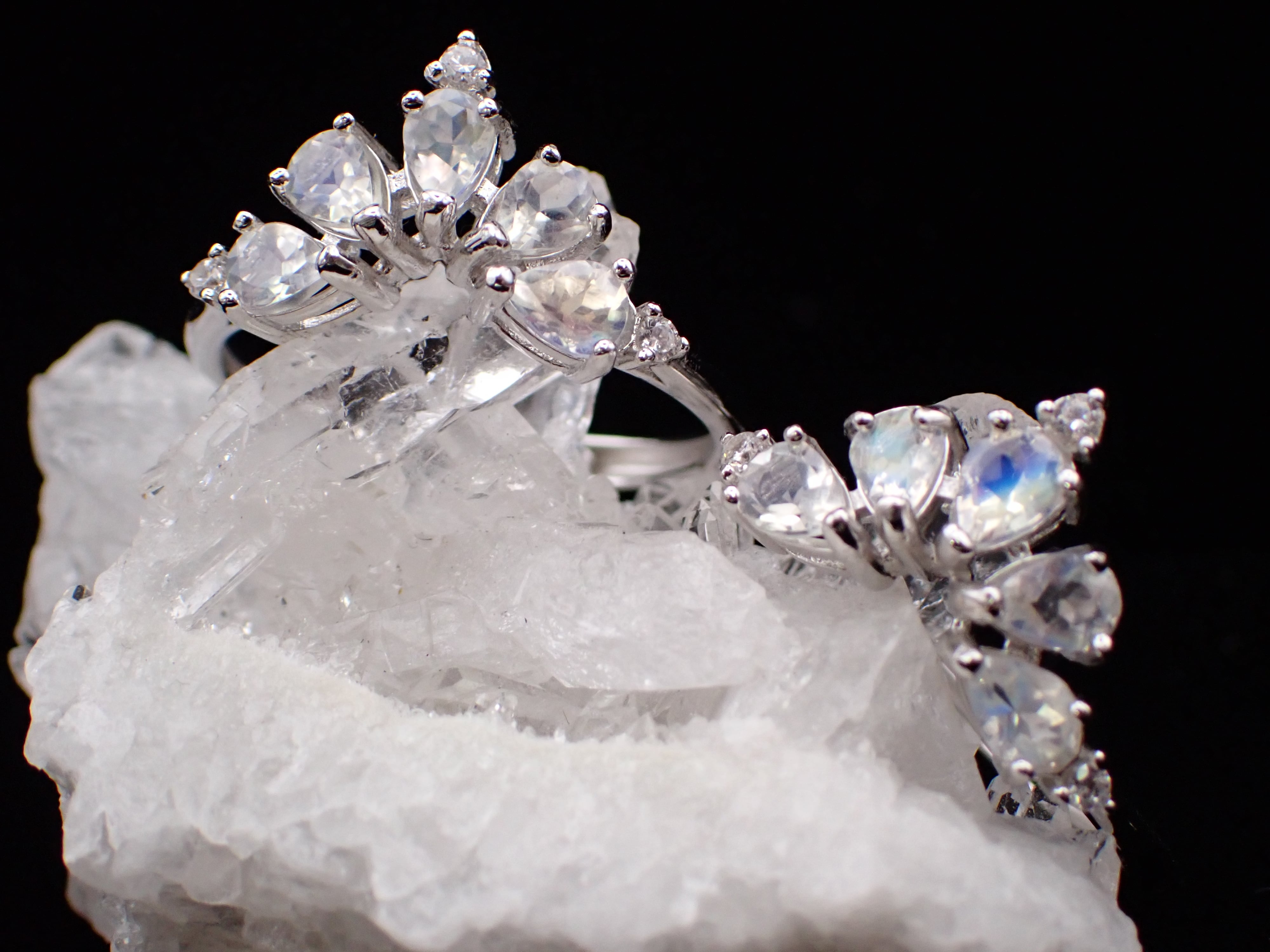 ドロップのアンデシンラブラドライトたちが5つ、孔雀が羽根をひろげたように並んだリングです。