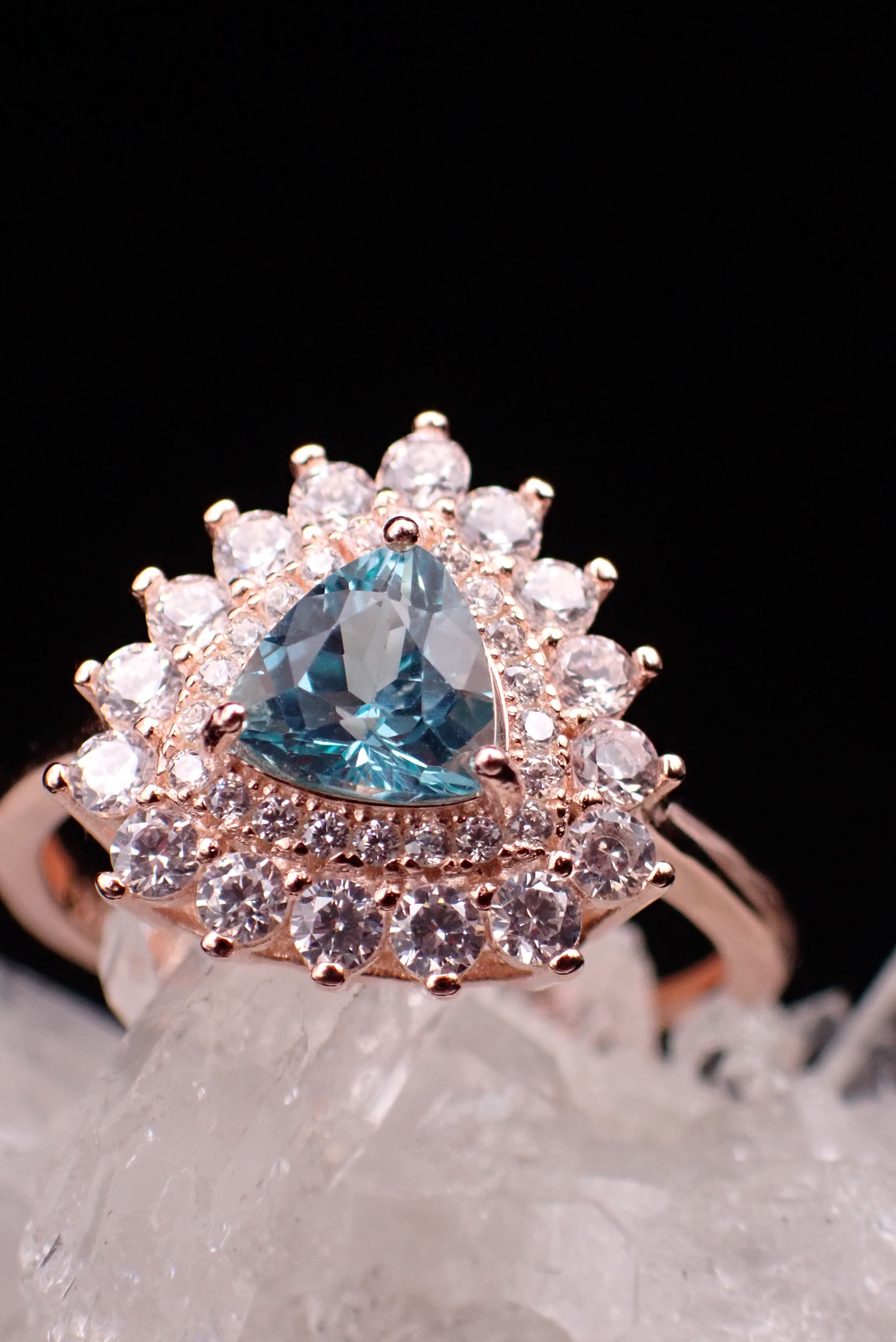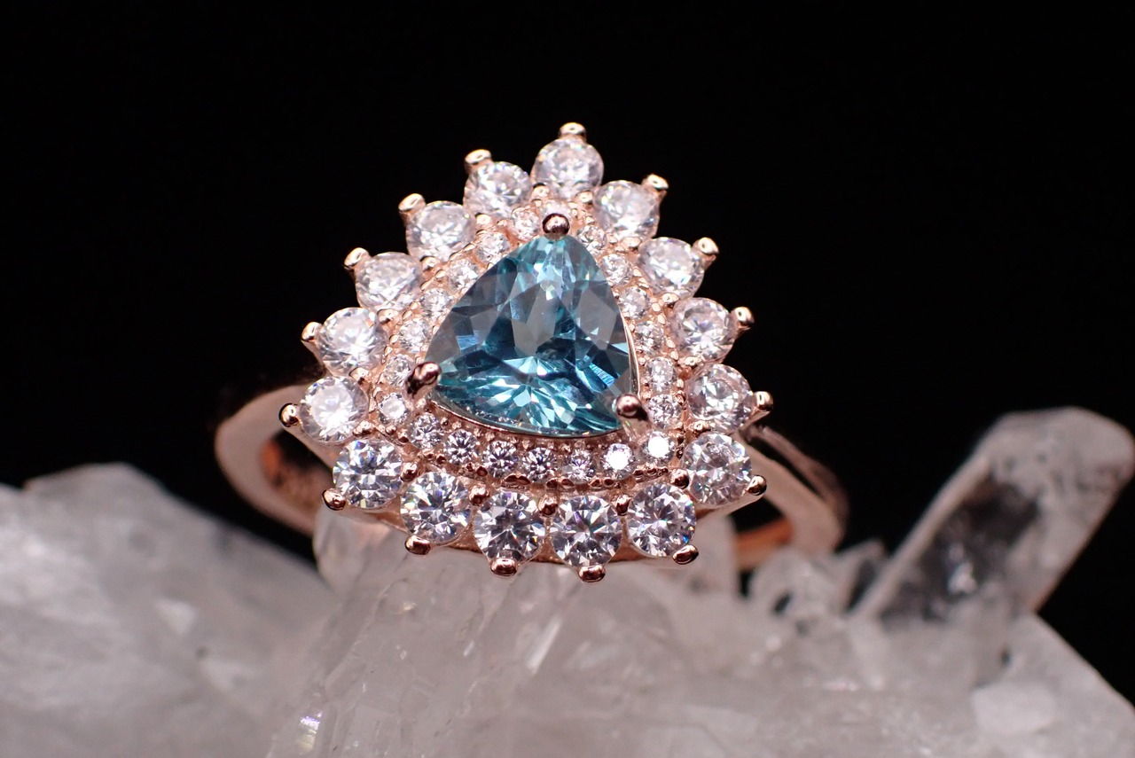 煌びやかに散るジルコニアの中央に佇む、やわらかなブルーグリーンが美しいアパタイトのリングです。