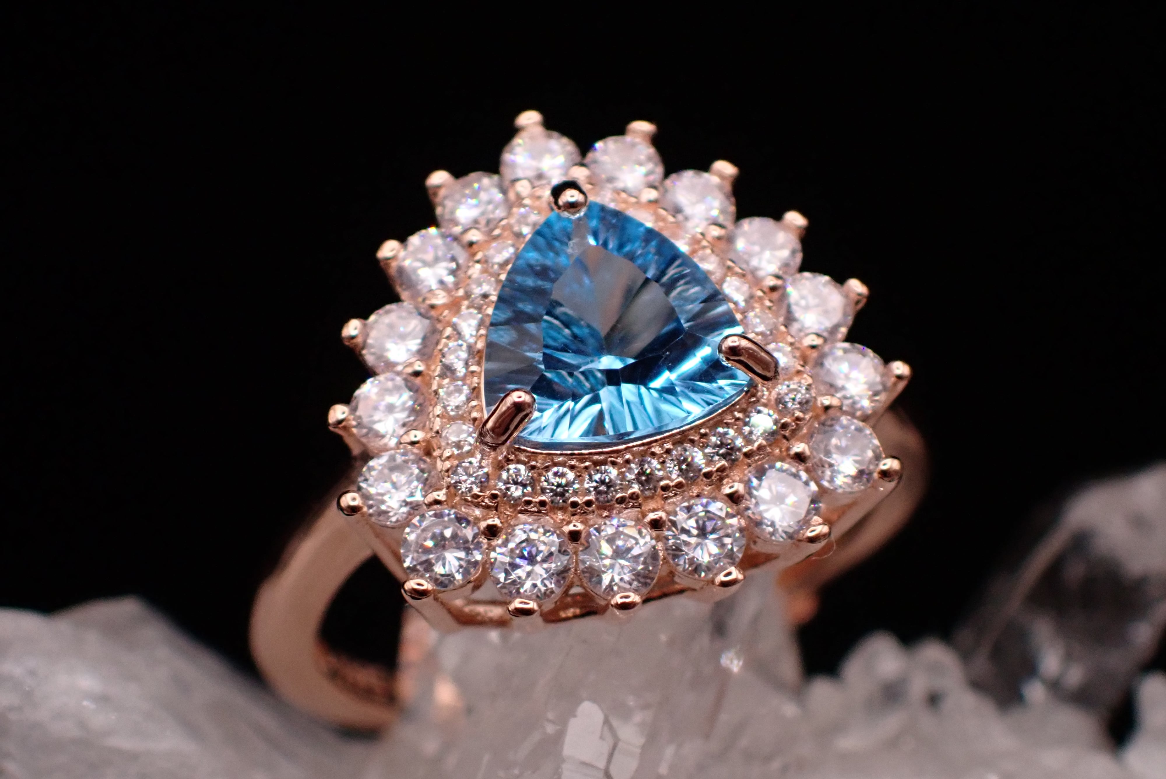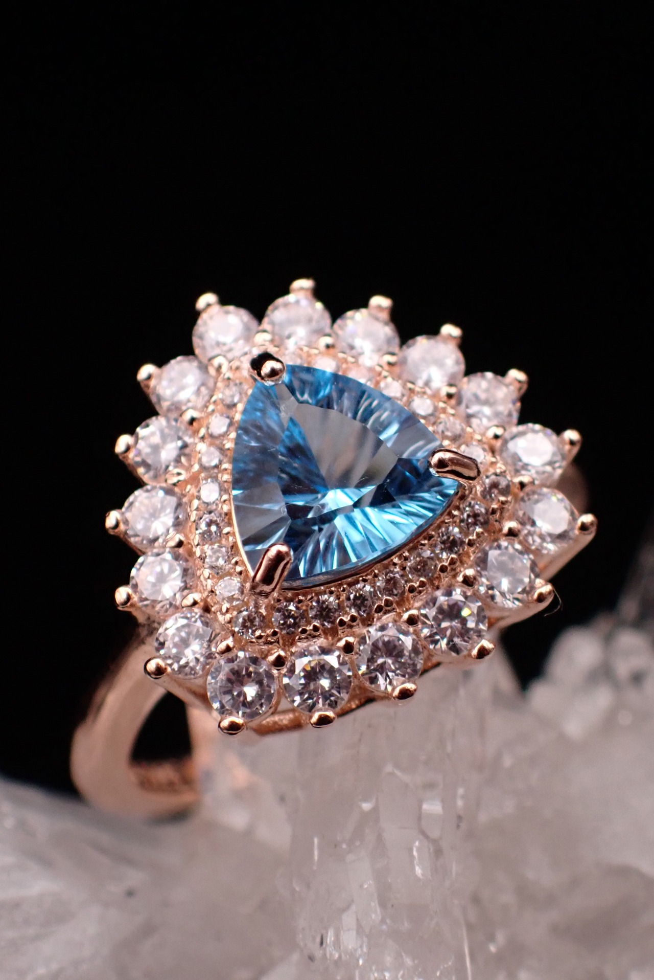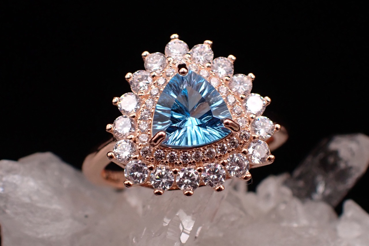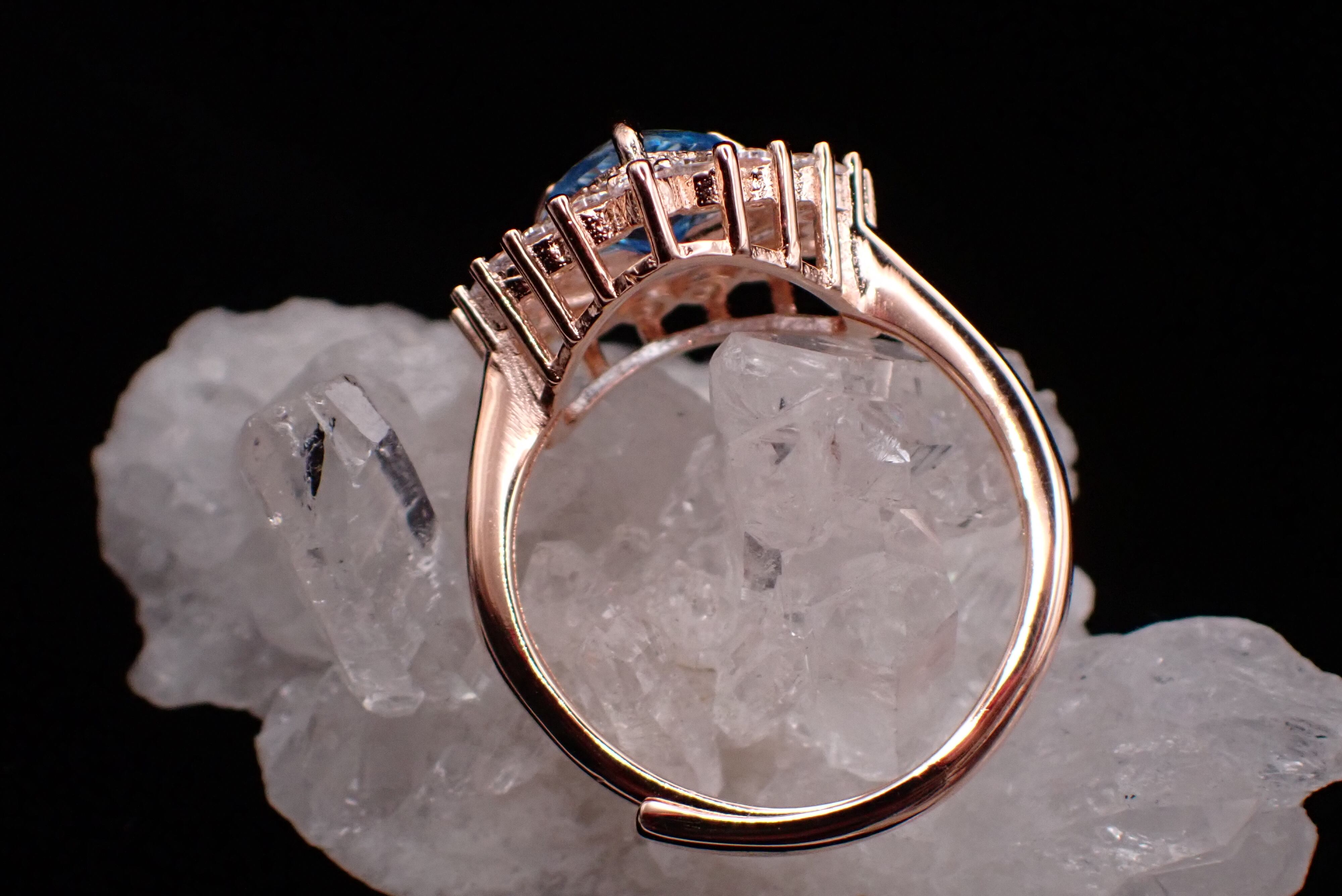 煌びやかに散るジルコニアの中央に佇む、はっきりとした青が美しいコンケーブブルートパーズのリングです。