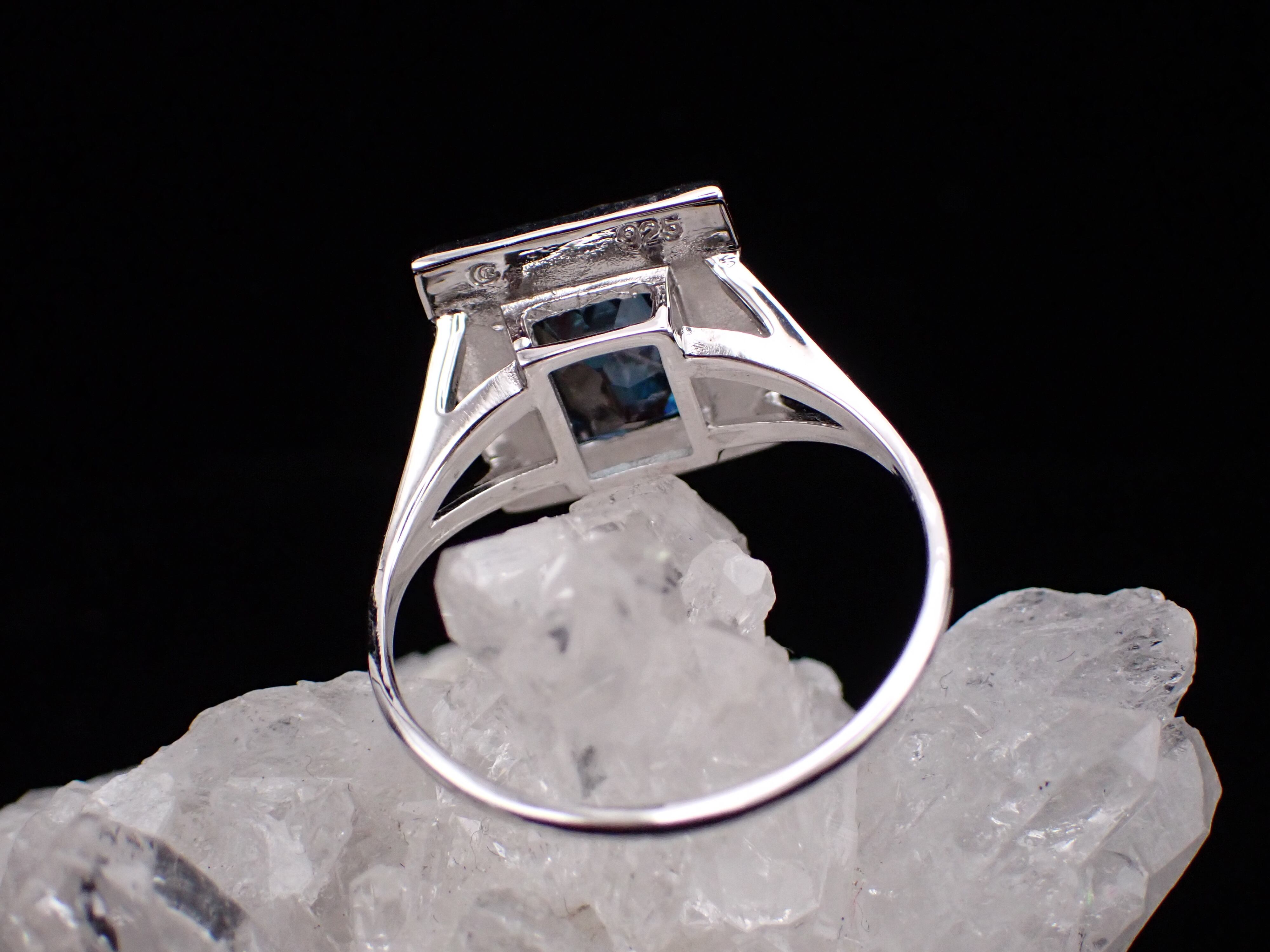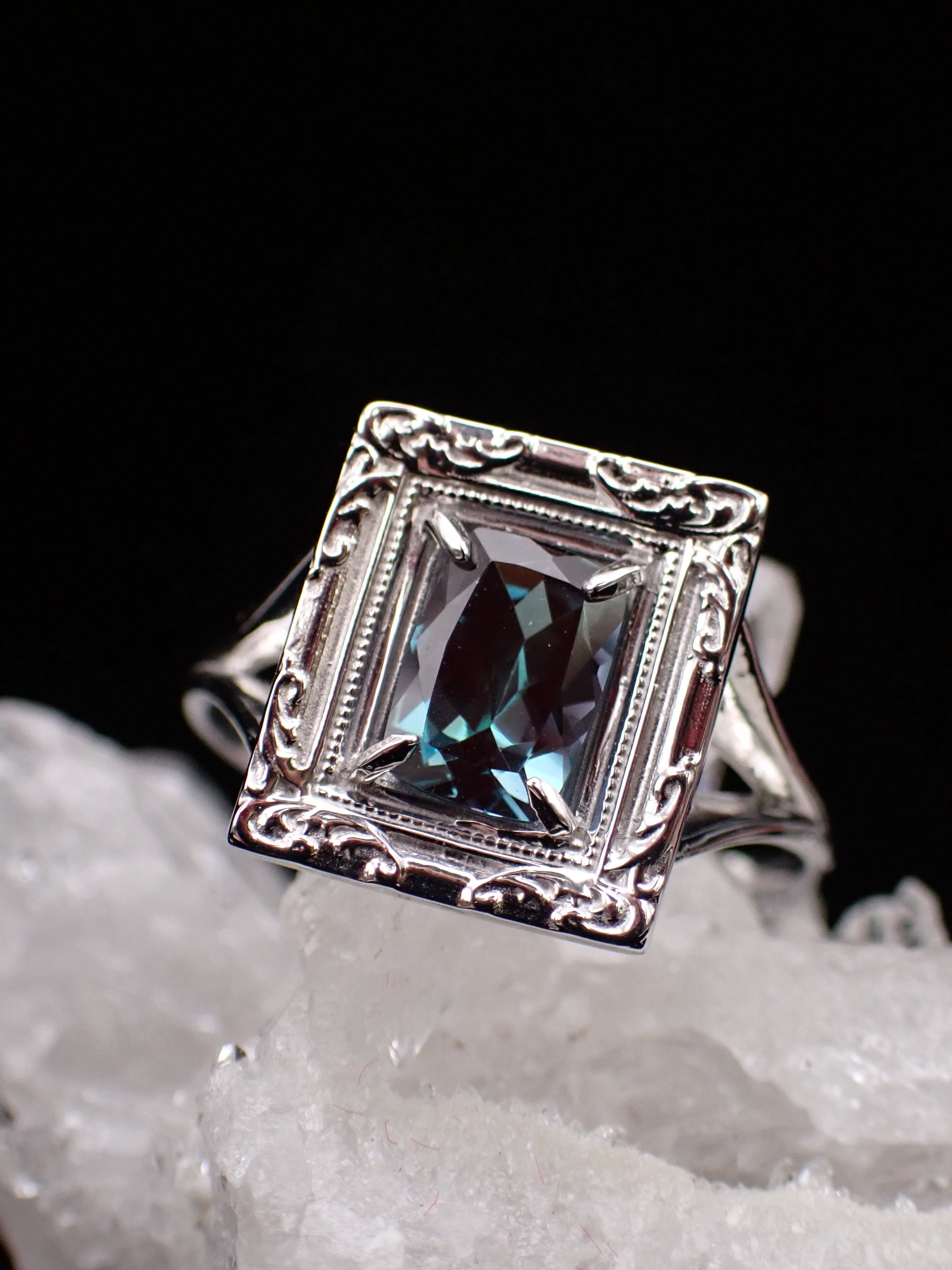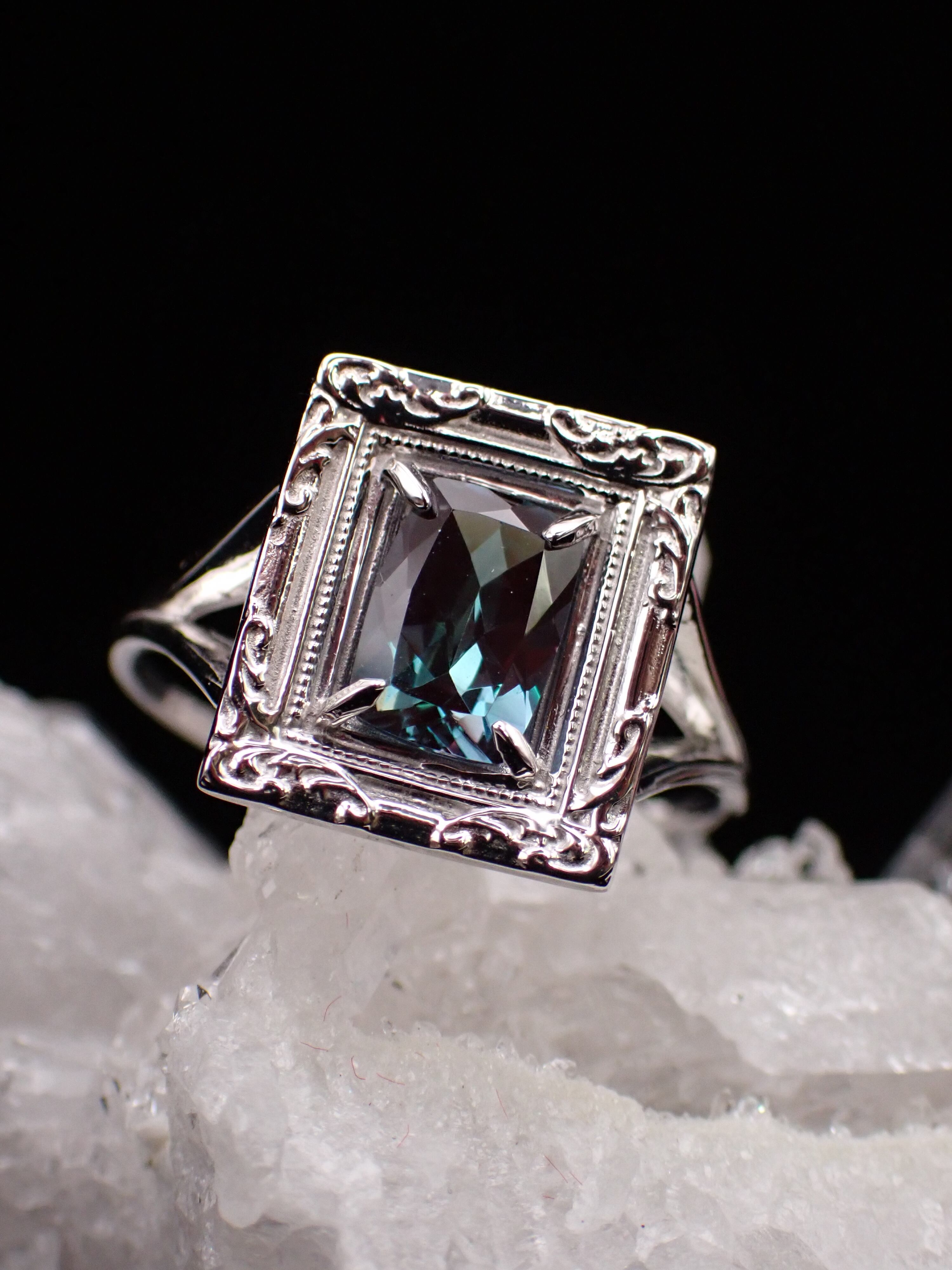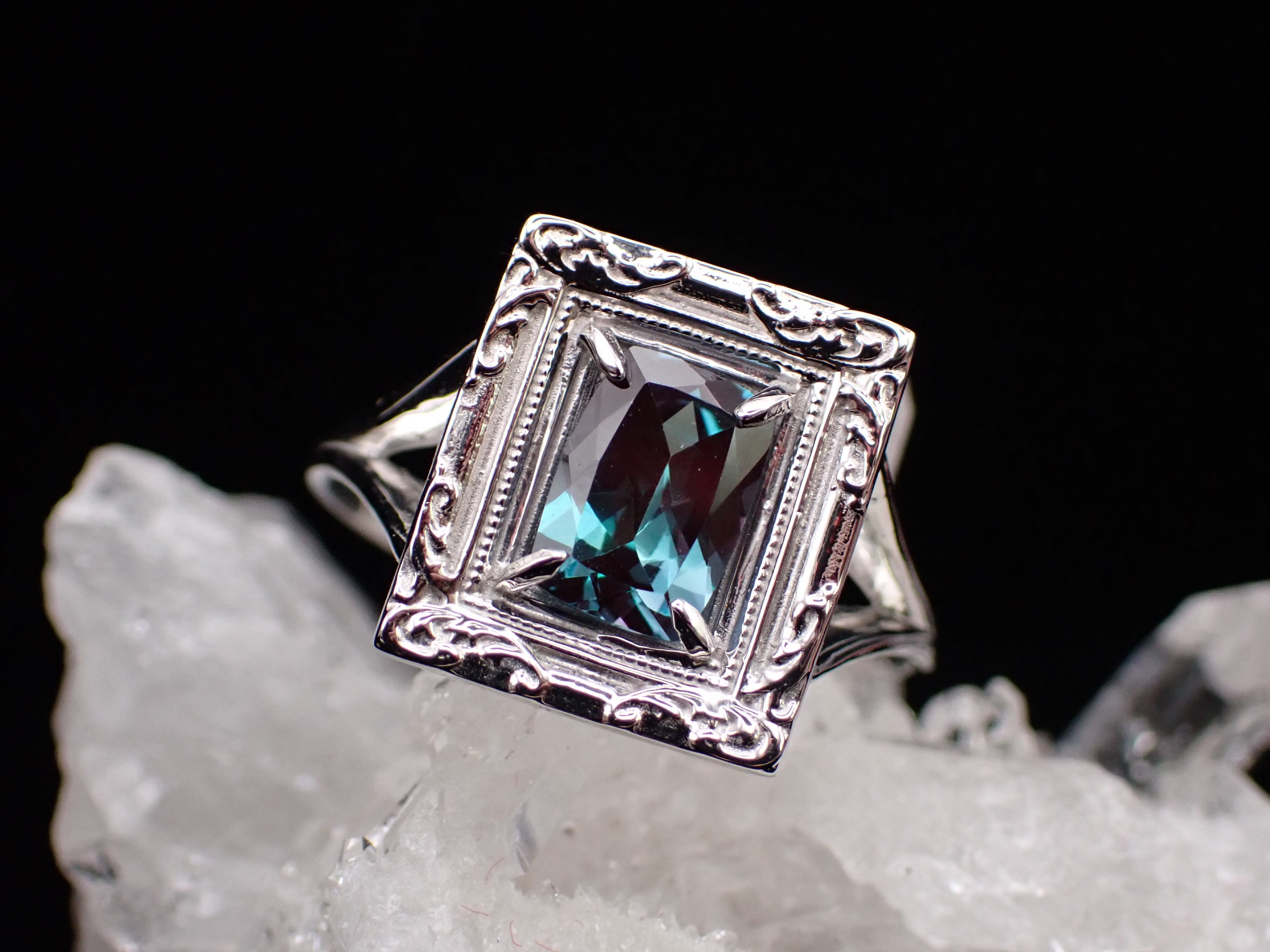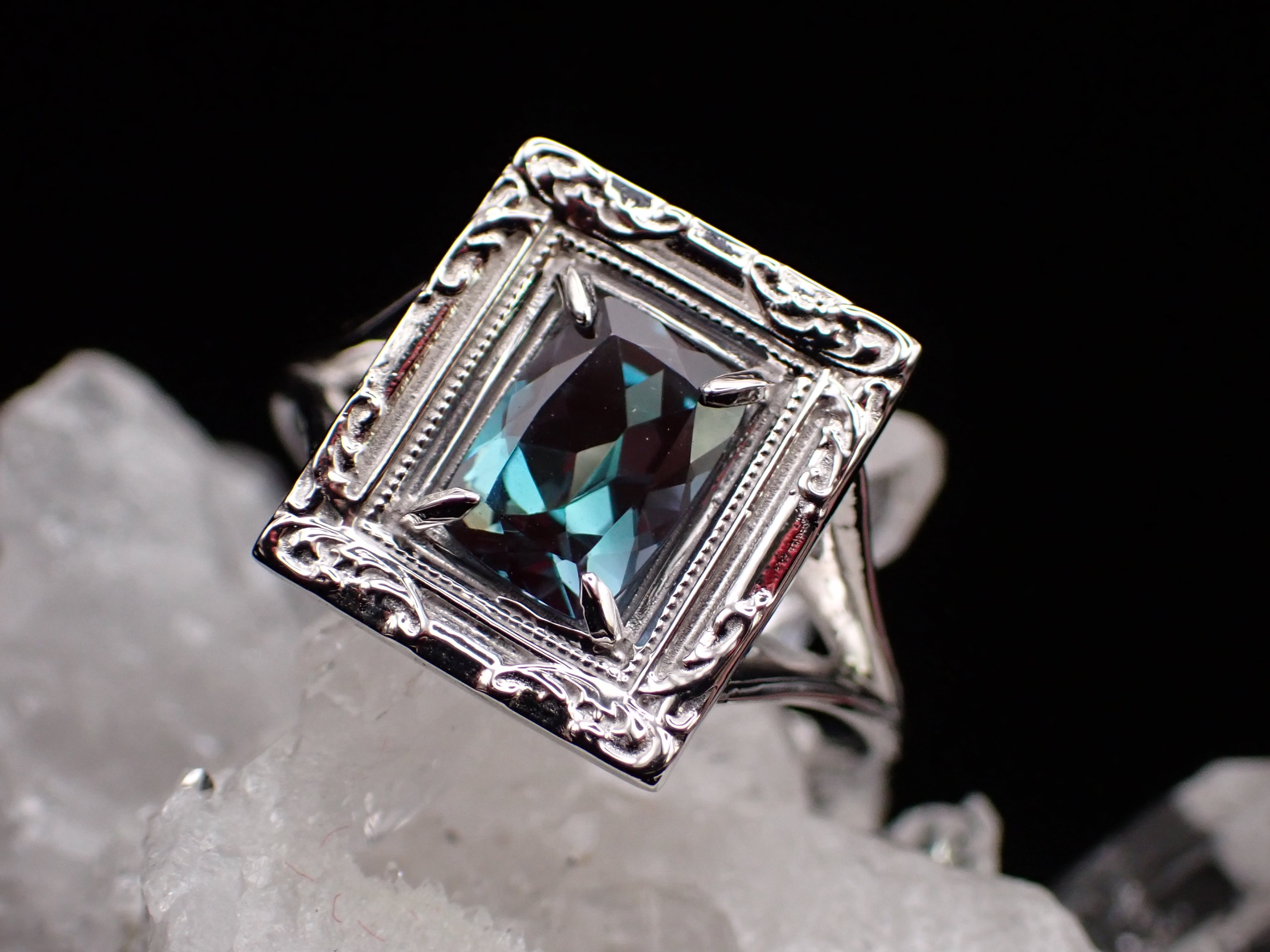 カラーチェンジと蛍光の美しい合成アレキサンドライトを絵画のように、美しい額縁の中へ納めました。
