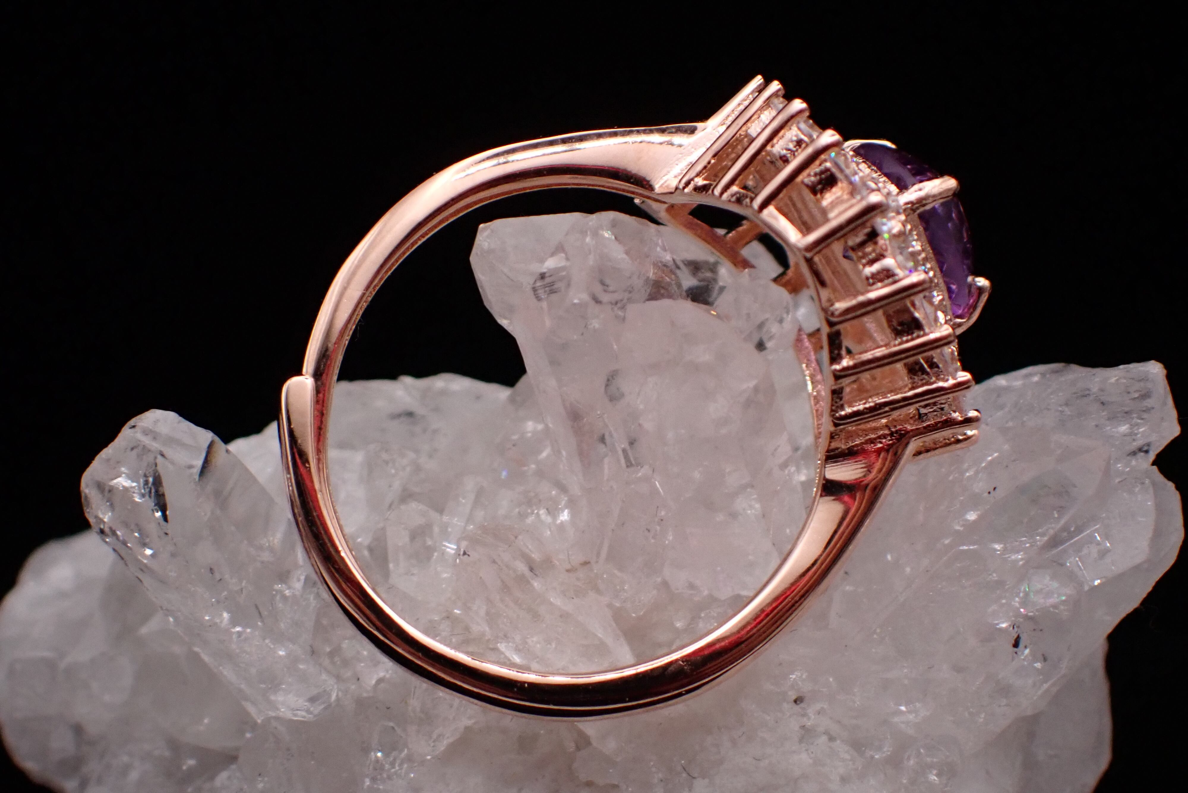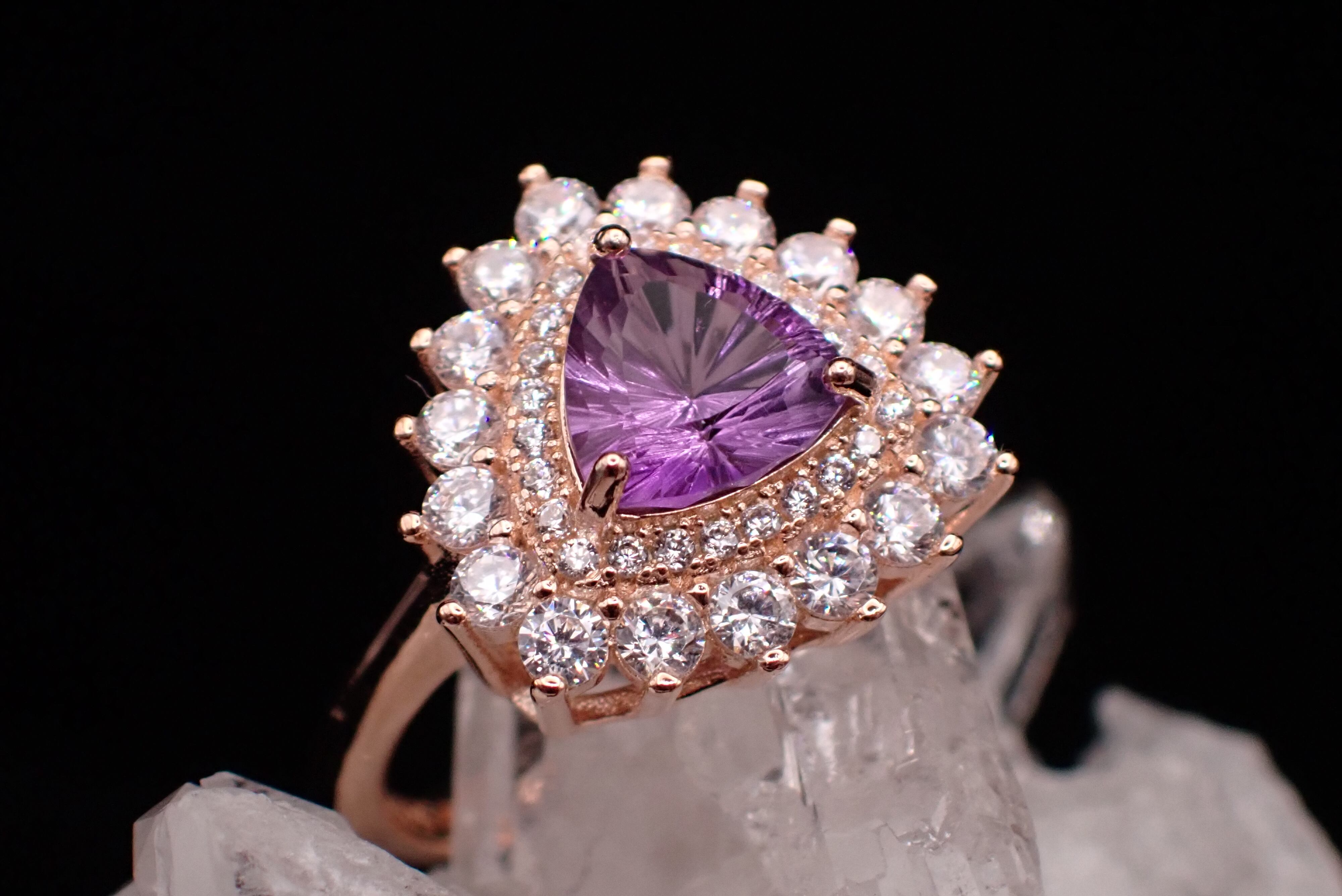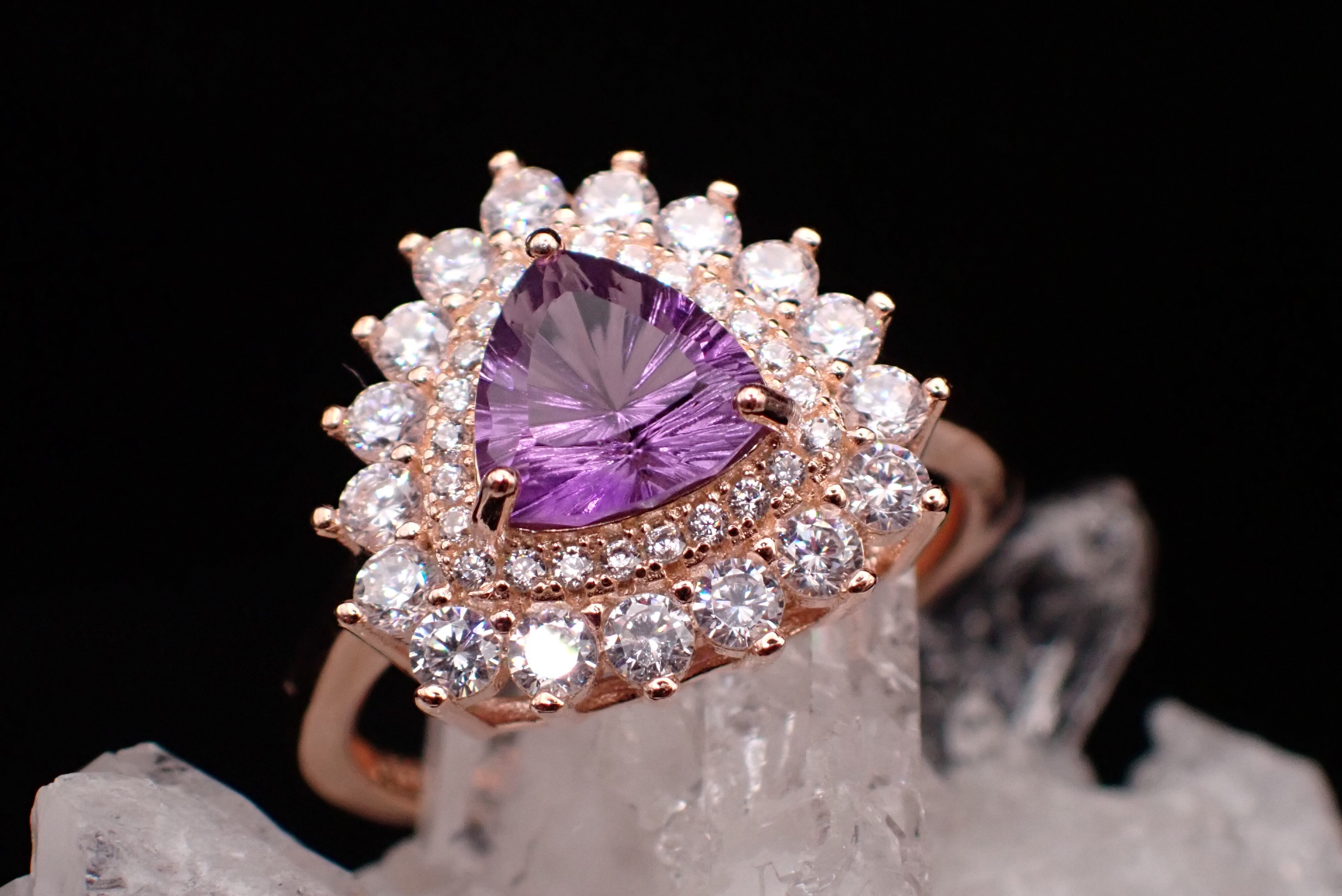 煌びやかに散るジルコニアの中央に佇む、やわらかなパープルが美しいコンケーブアメジストのリングです。
