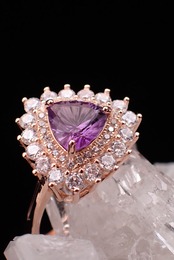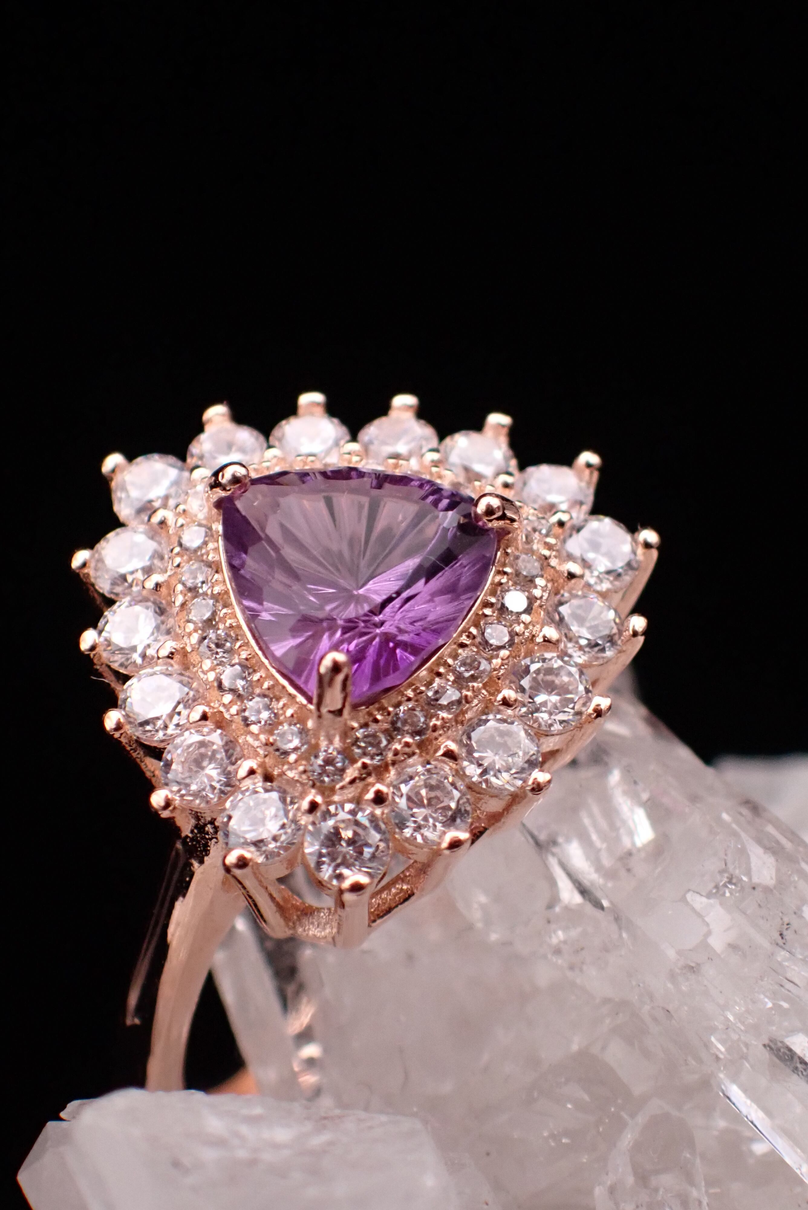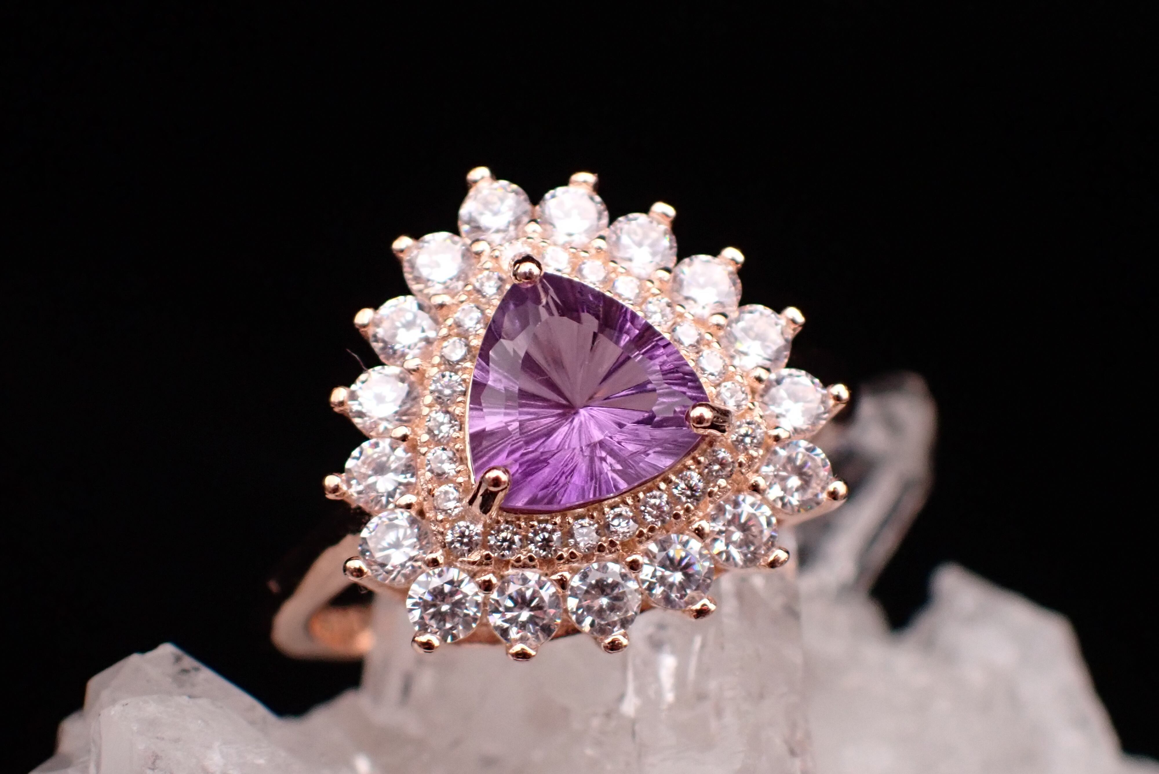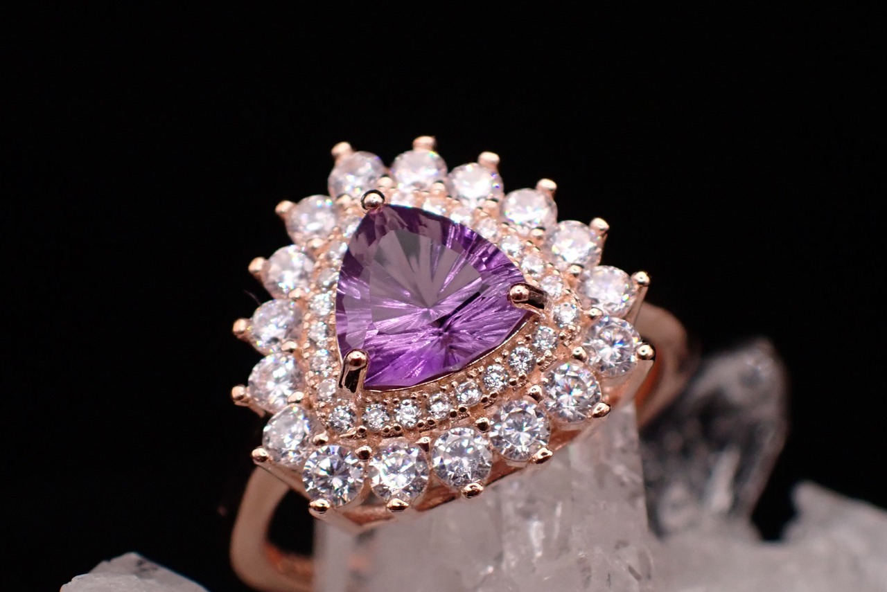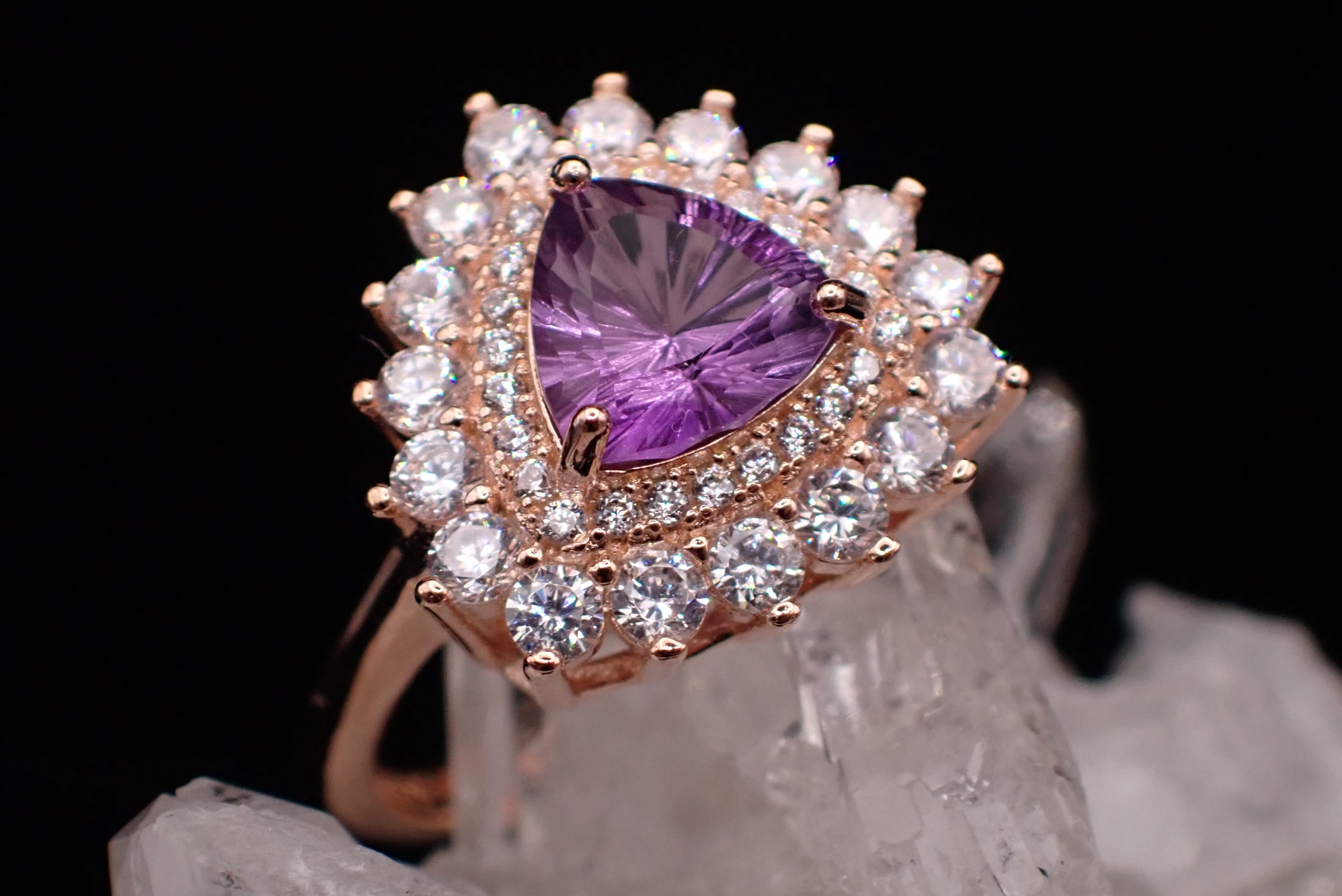 煌びやかに散るジルコニアの中央に佇む、やわらかなパープルが美しいコンケーブアメジストのリングです。