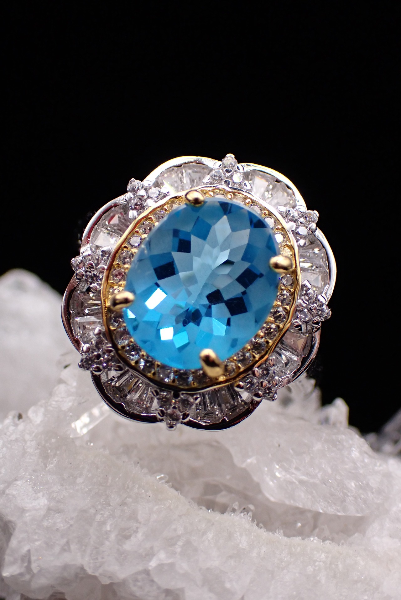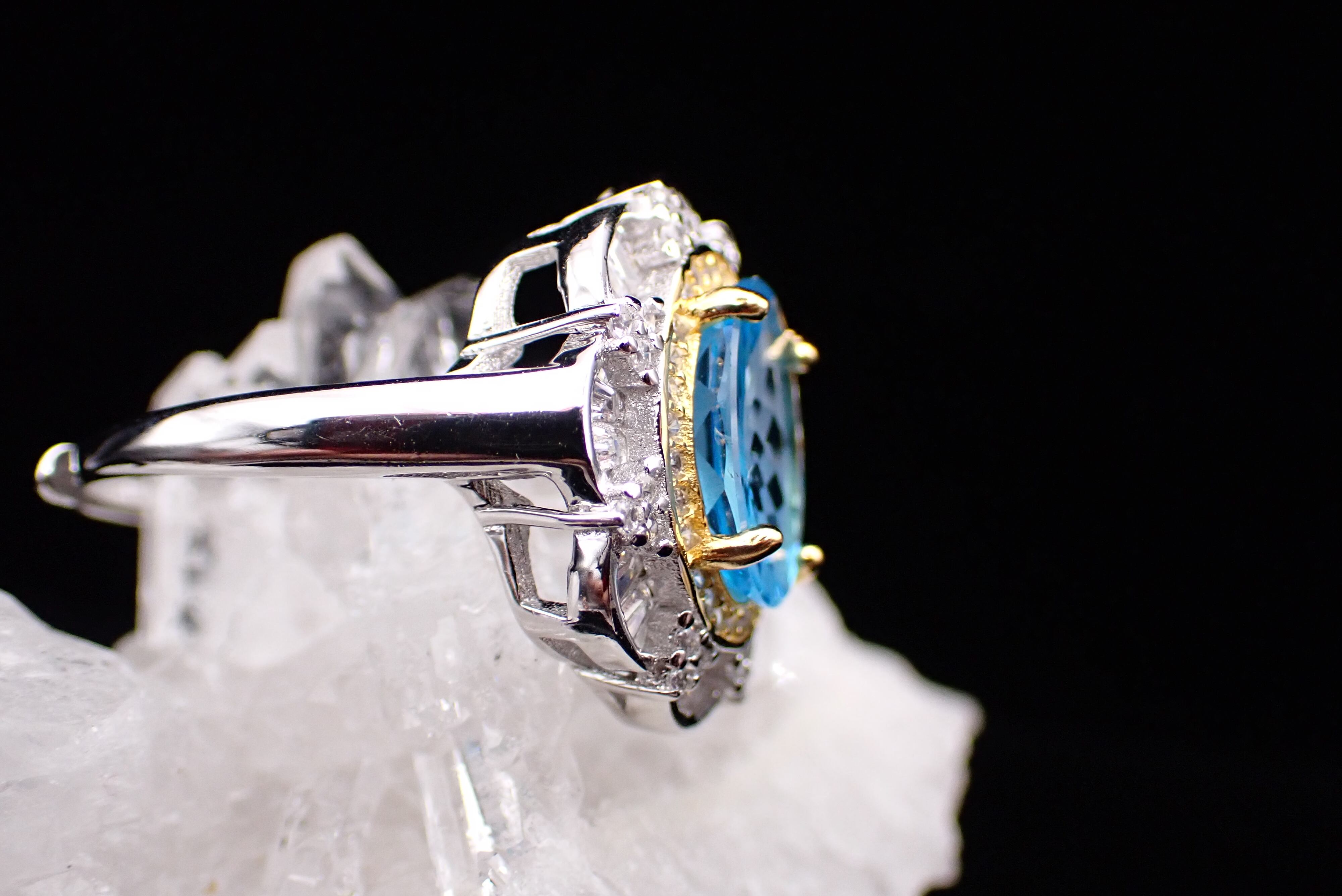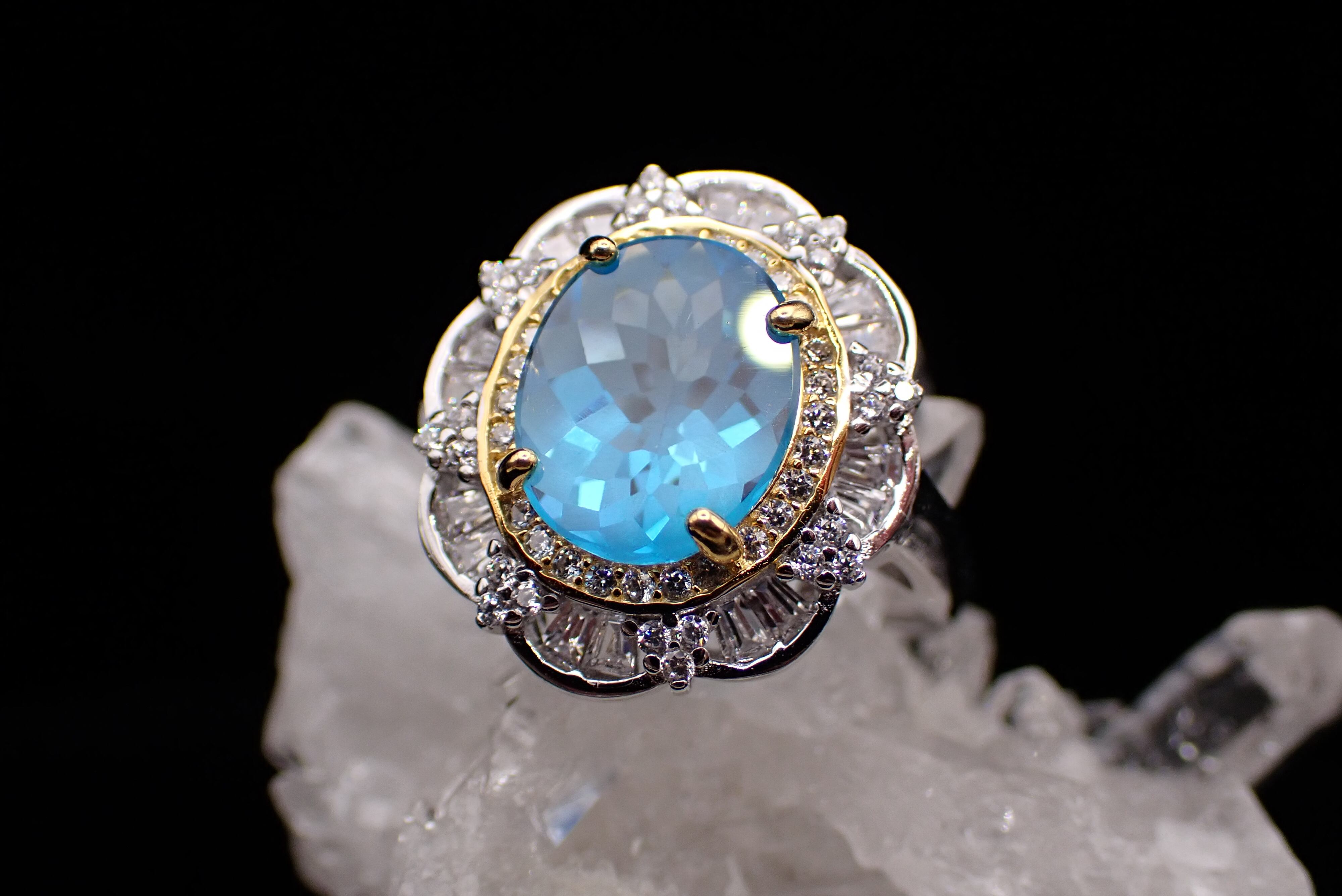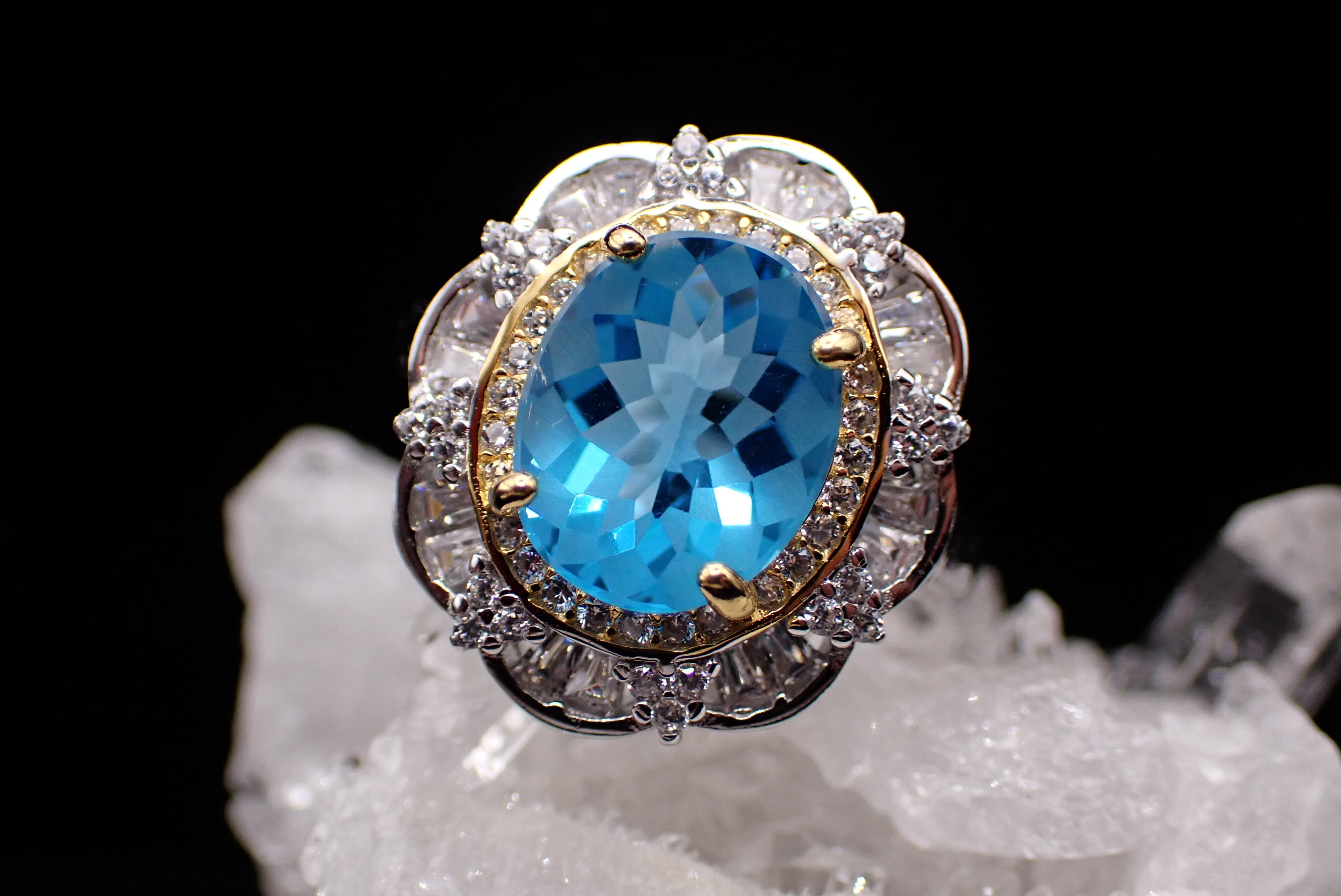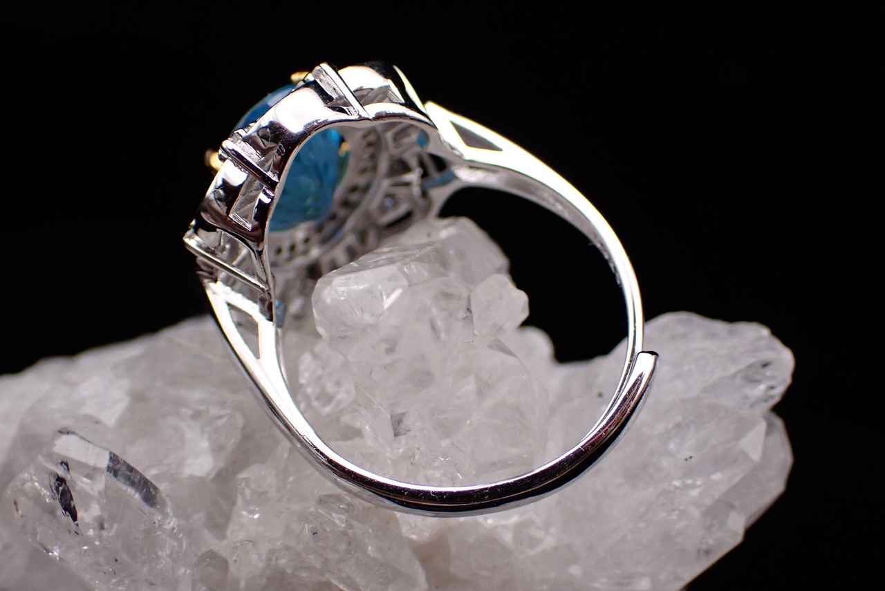 取り巻きのジルコニアたちがキラキラと輝き、ブルートパーズの輝きを引き立てます。