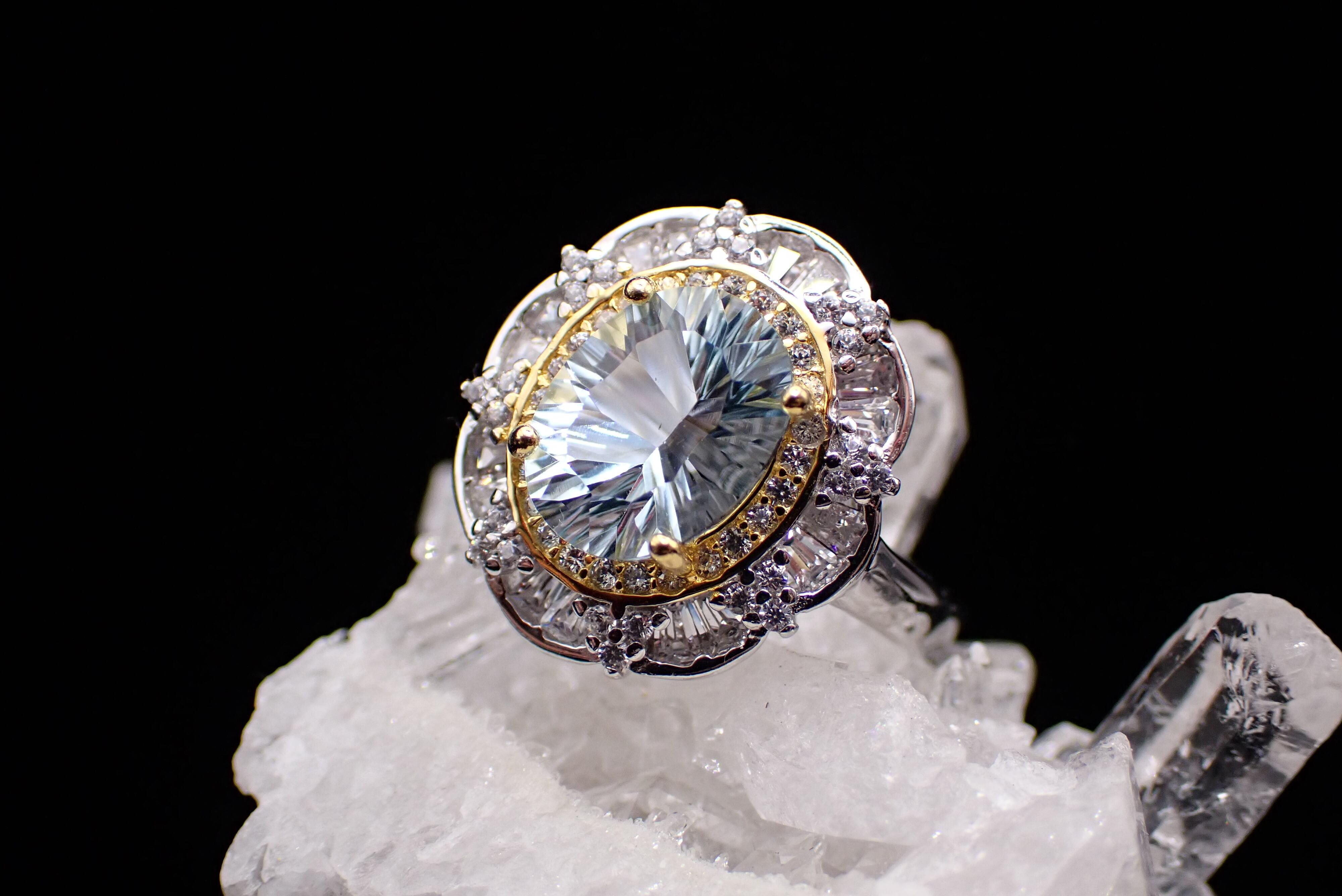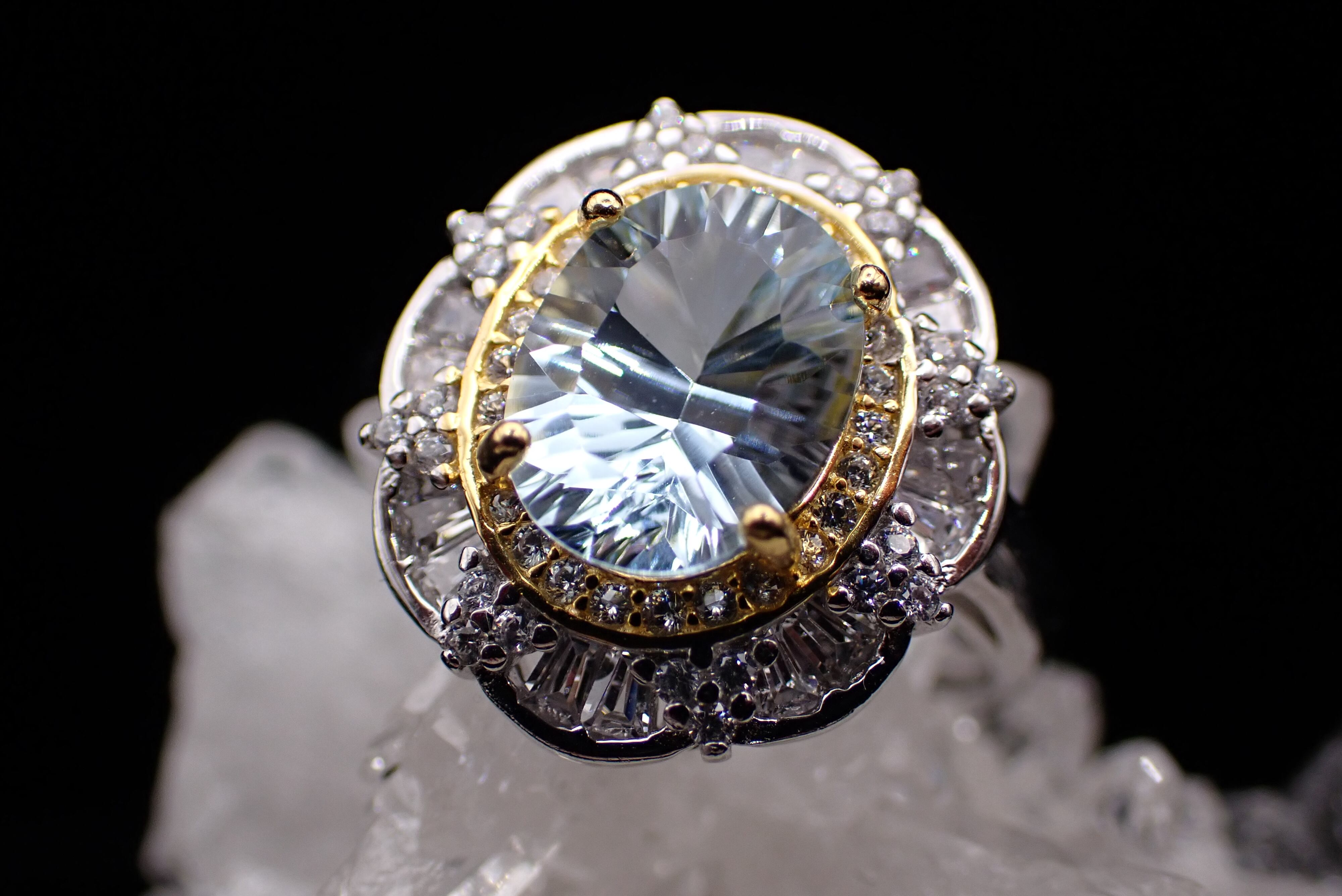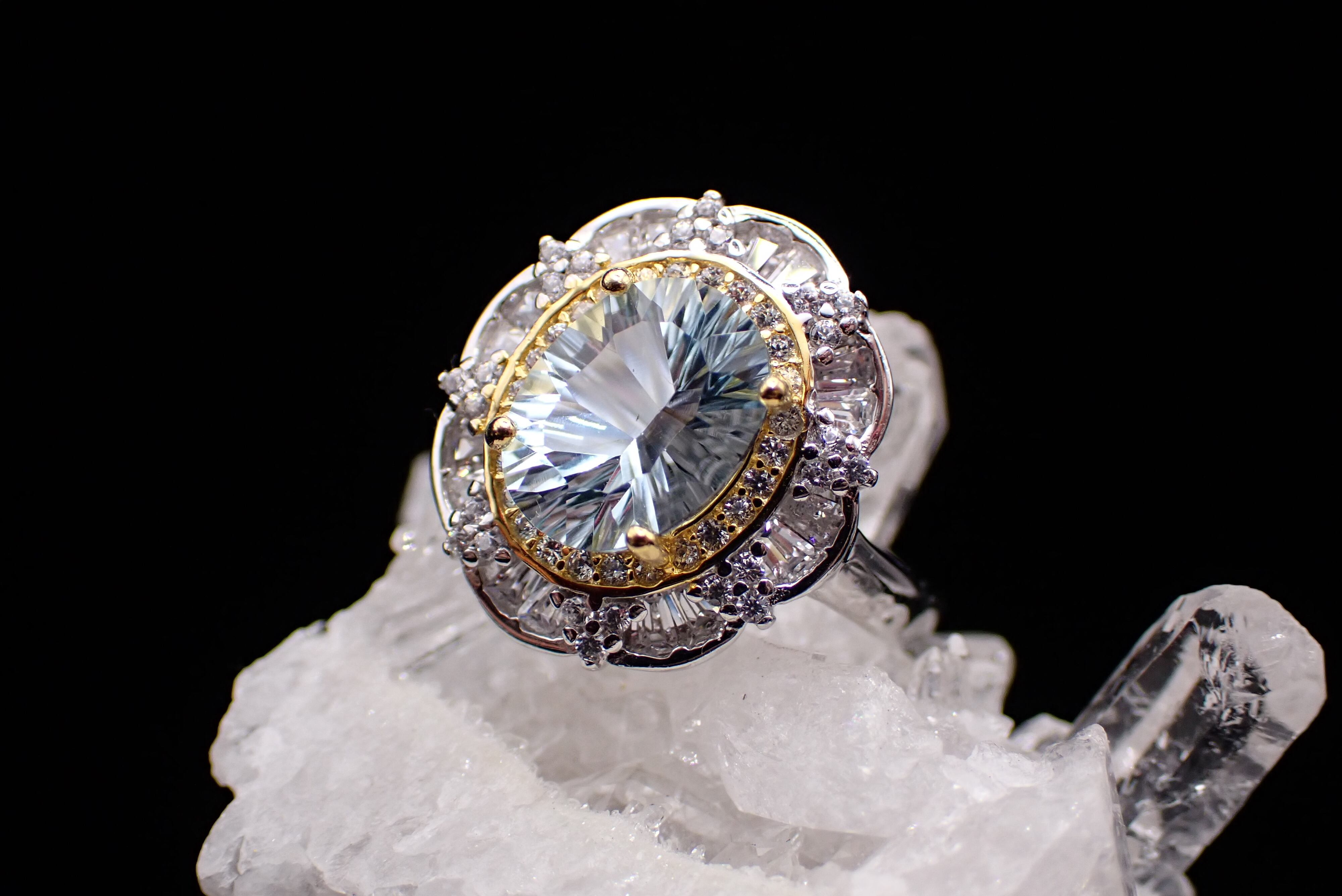 取り巻きのジルコニアたちがキラキラと輝き、アクアマリンの美しい輝きを引き立てます。