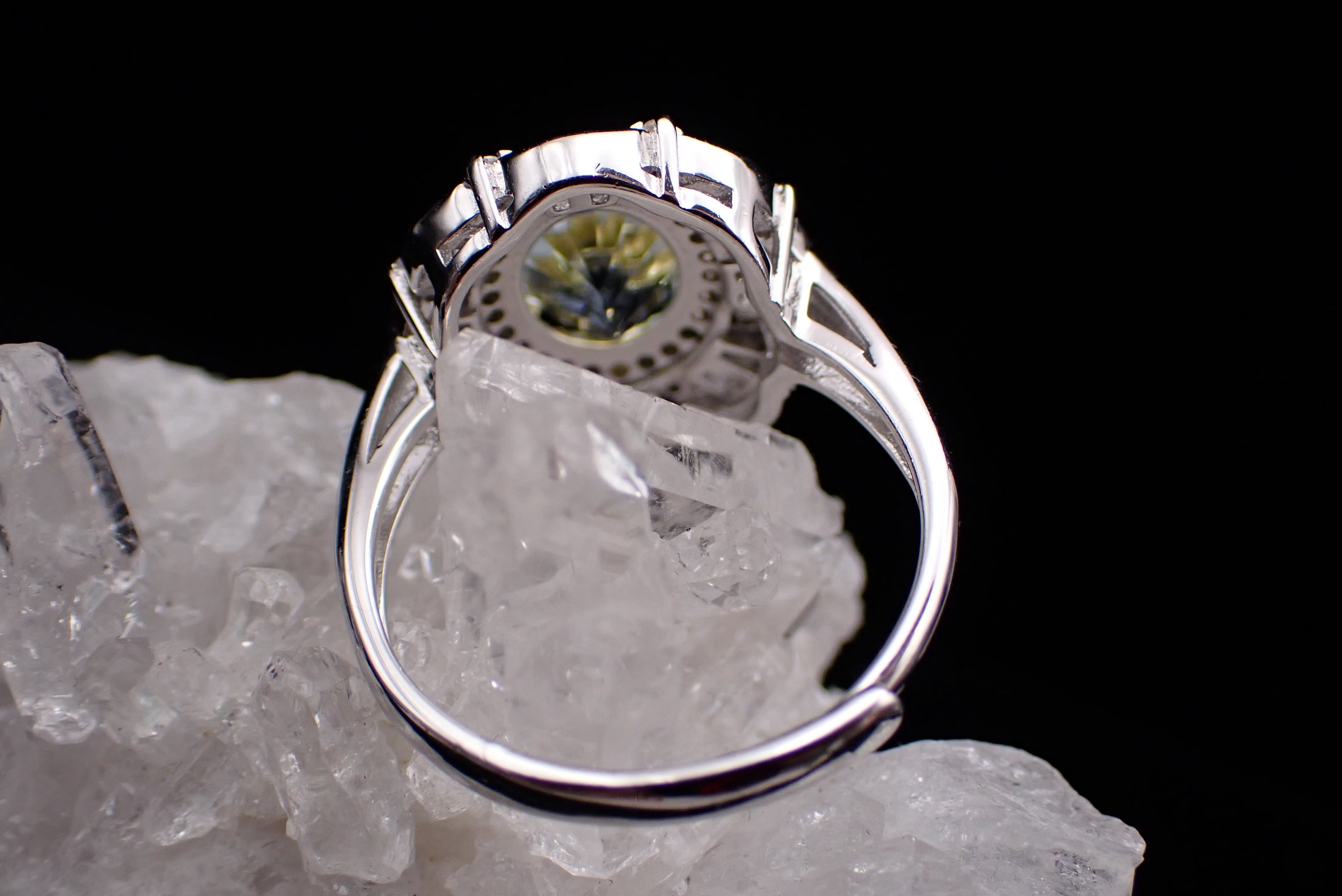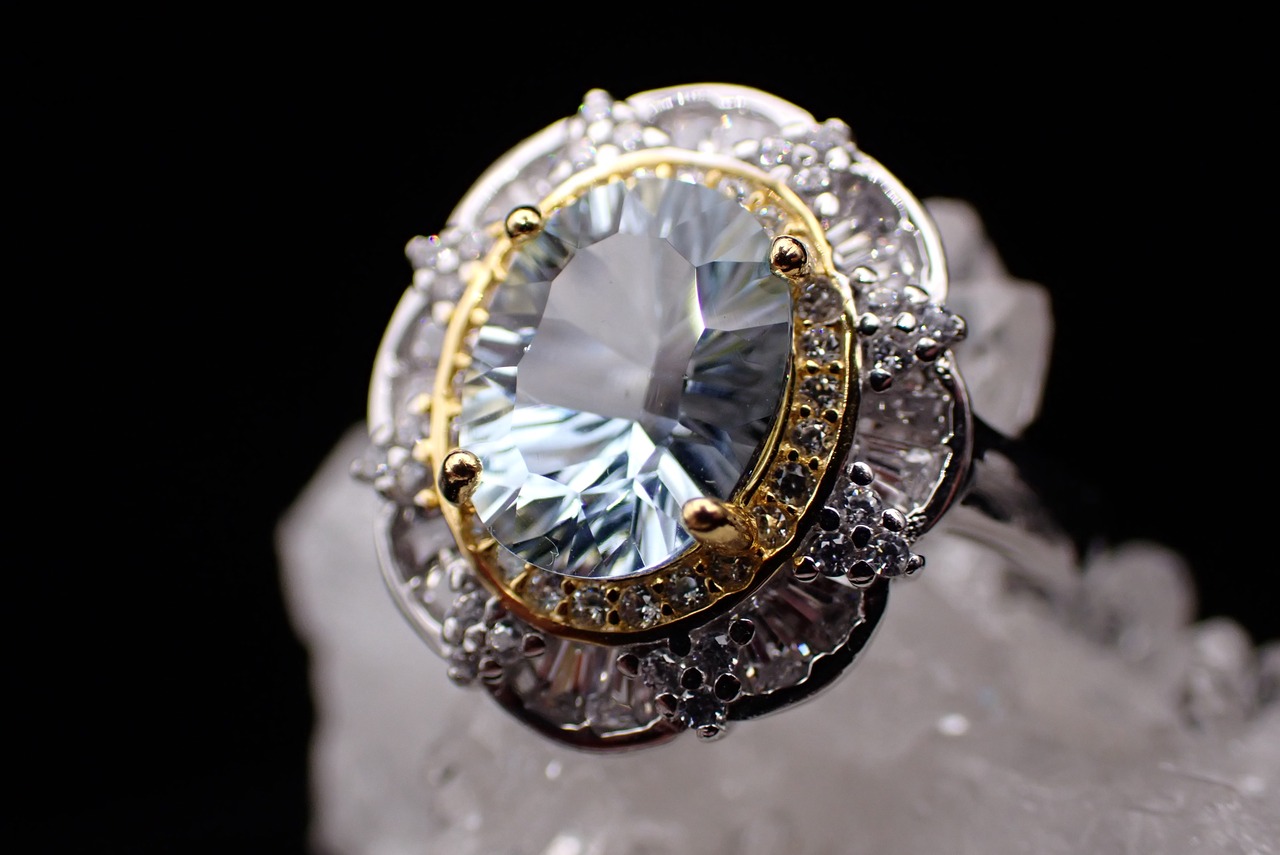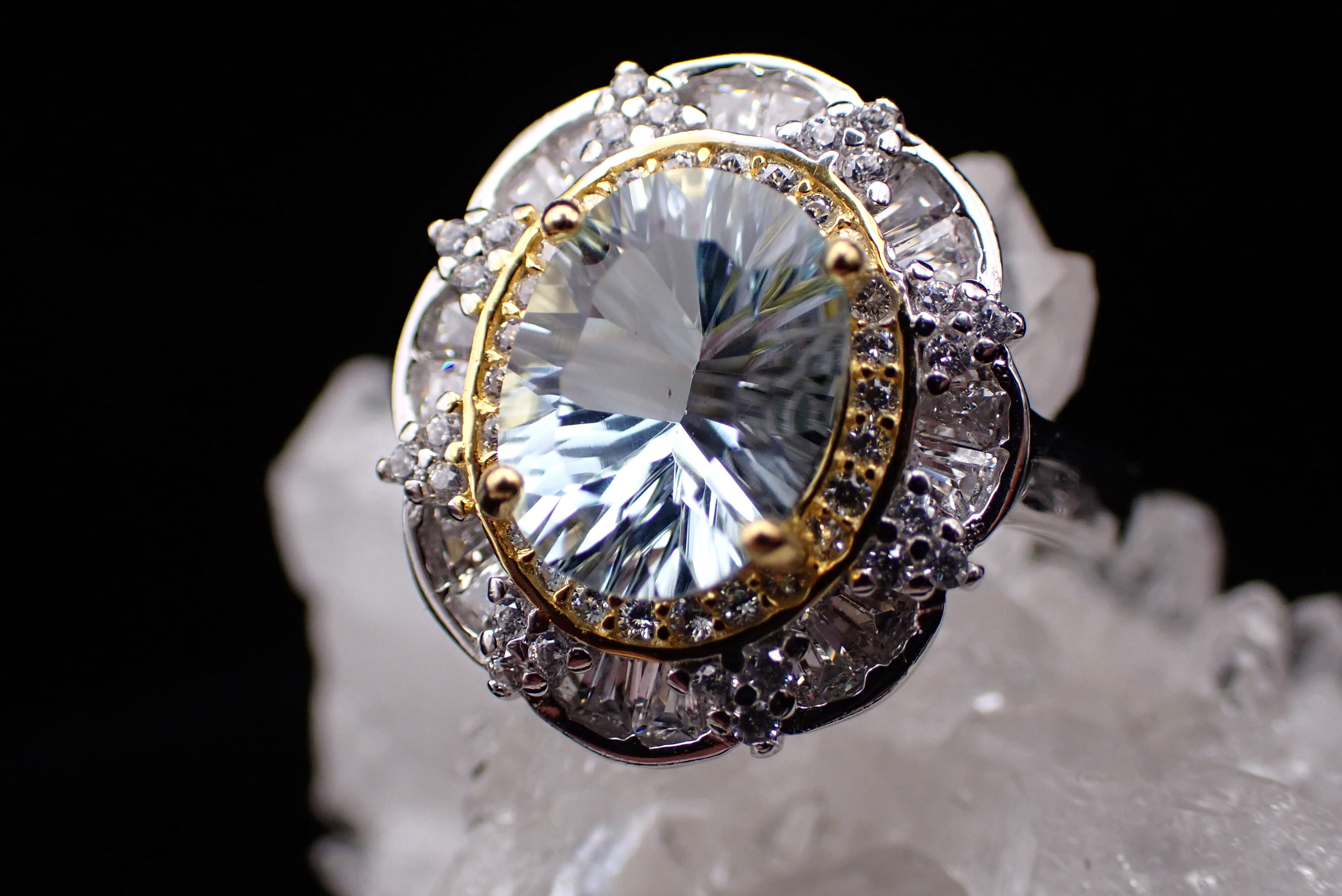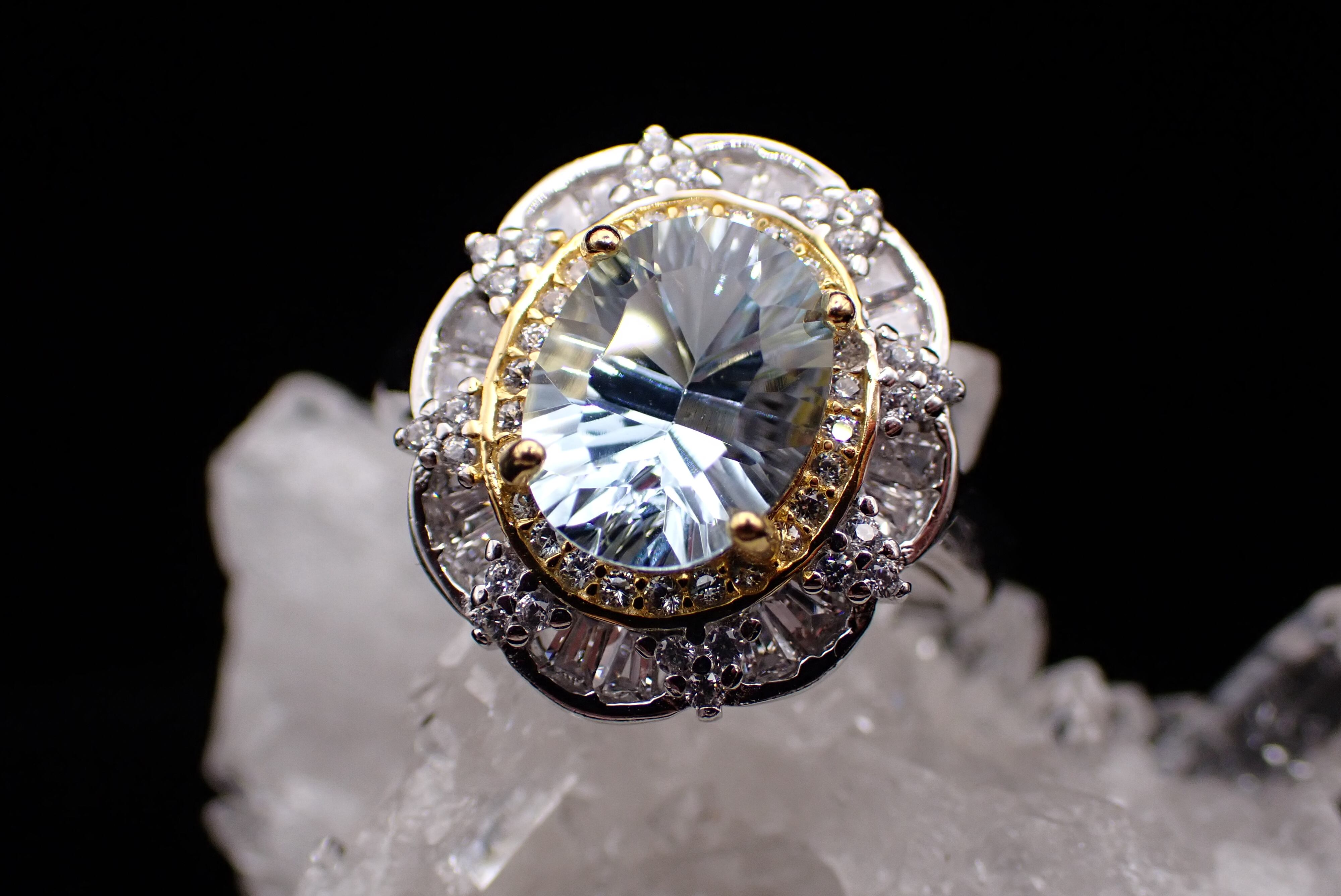 取り巻きのジルコニアたちがキラキラと輝き、アクアマリンの美しい輝きを引き立てます。